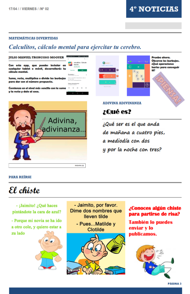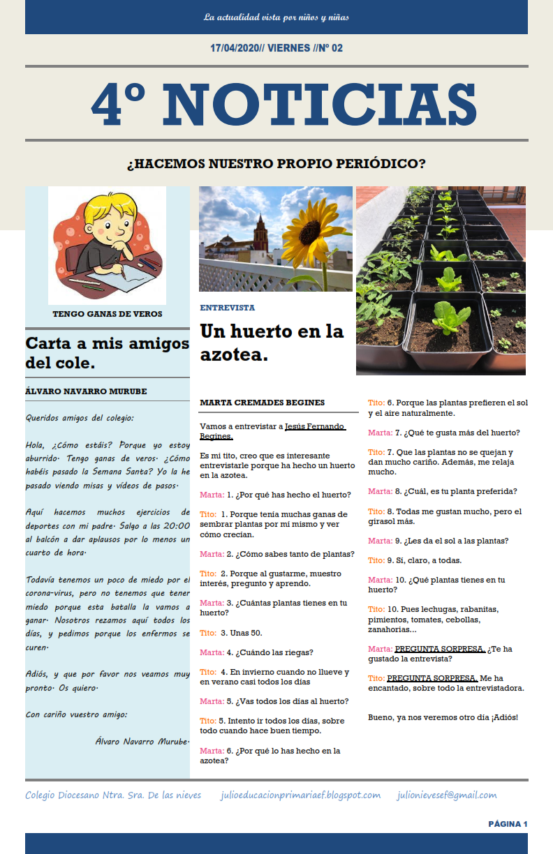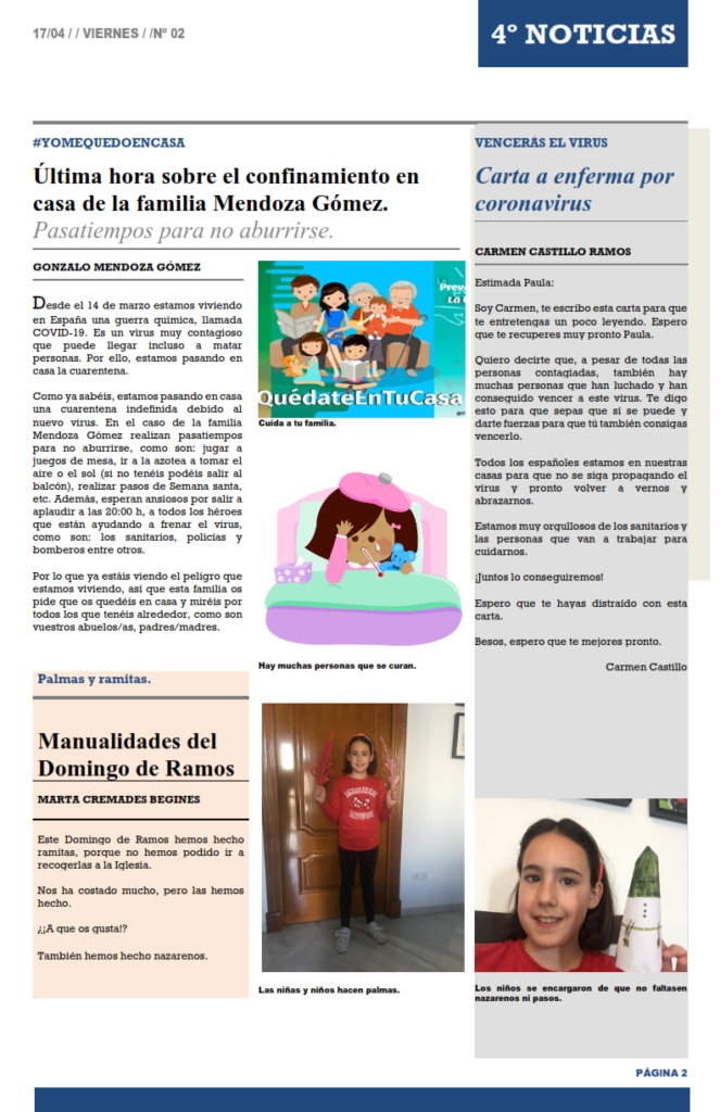 Las circunstancias que nos están tocando vivir, nos dan la oportunidad de contar nuestras vivencias, dar nuestras opiniones o crear noticias. De este modo, diferentes niños y niñas, de forma voluntaria, siguen aportando sus textos para que cada semana se publique un nuevo ejemplar.