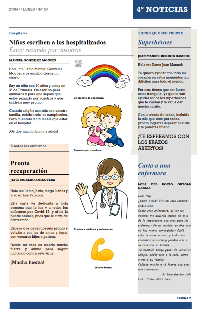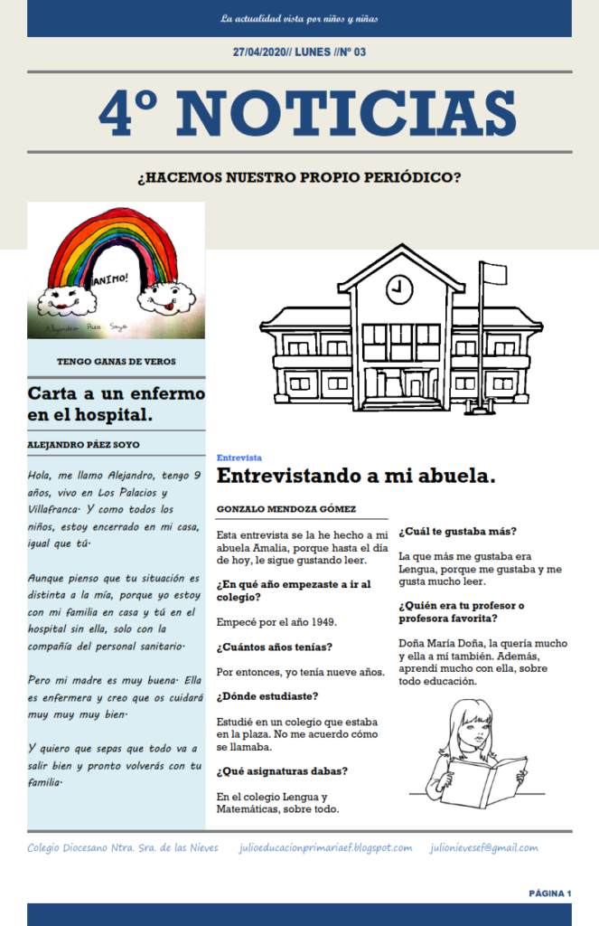 Las circunstancias que nos están tocando vivir, nos dan la oportunidad de contar nuestras vivencias, dar nuestras opiniones o crear noticias. De este modo, diferentes niños y niñas, de forma voluntaria, siguen aportando sus textos para que cada semana se publique un nuevo ejemplar.