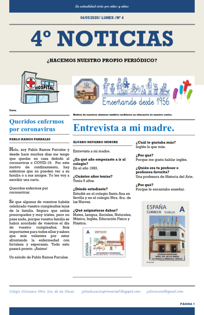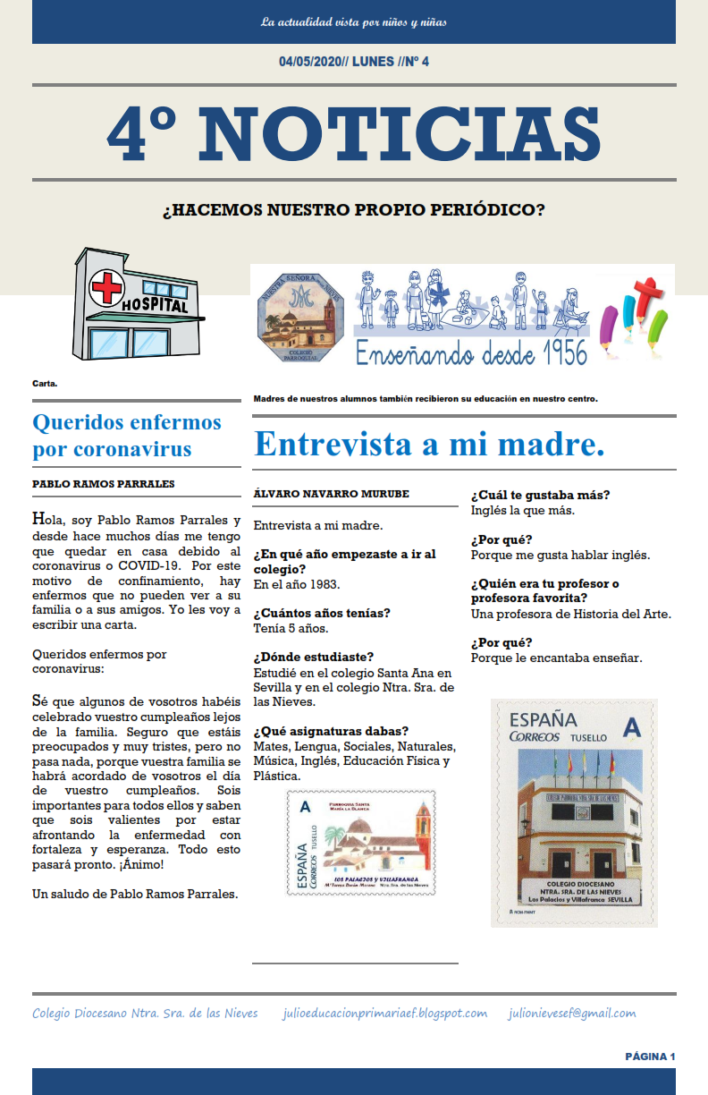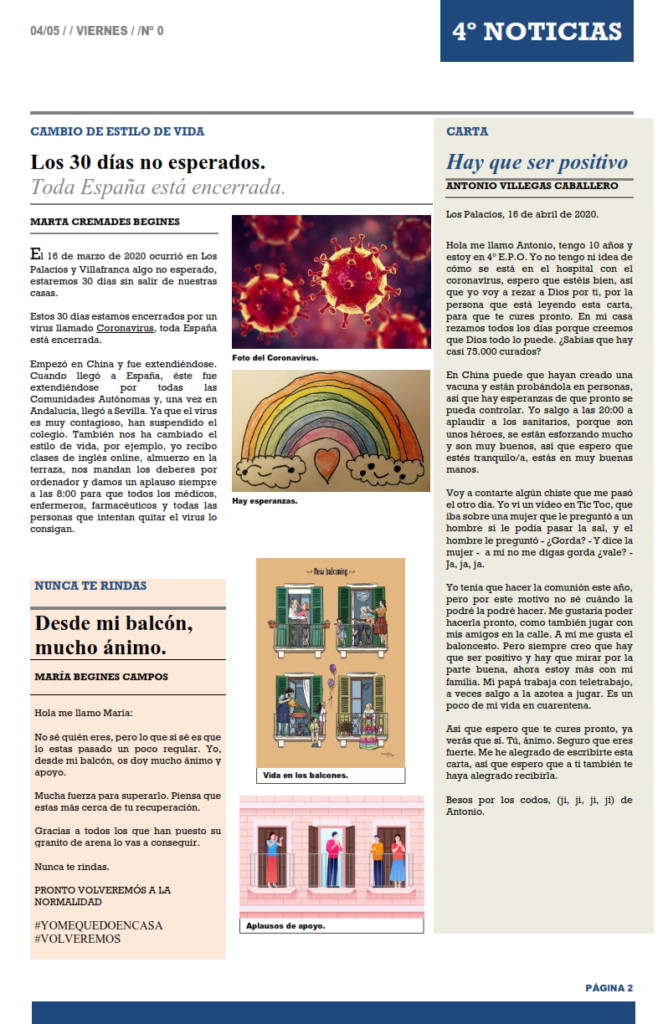 Las circunstancias que nos están tocando vivir, nos dan la oportunidad de contar nuestras vivencias, dar nuestras opiniones o crear noticias. De este modo, diferentes niños y niñas, de forma voluntaria, siguen aportando sus textos para que cada semana se publique un nuevo ejemplar.