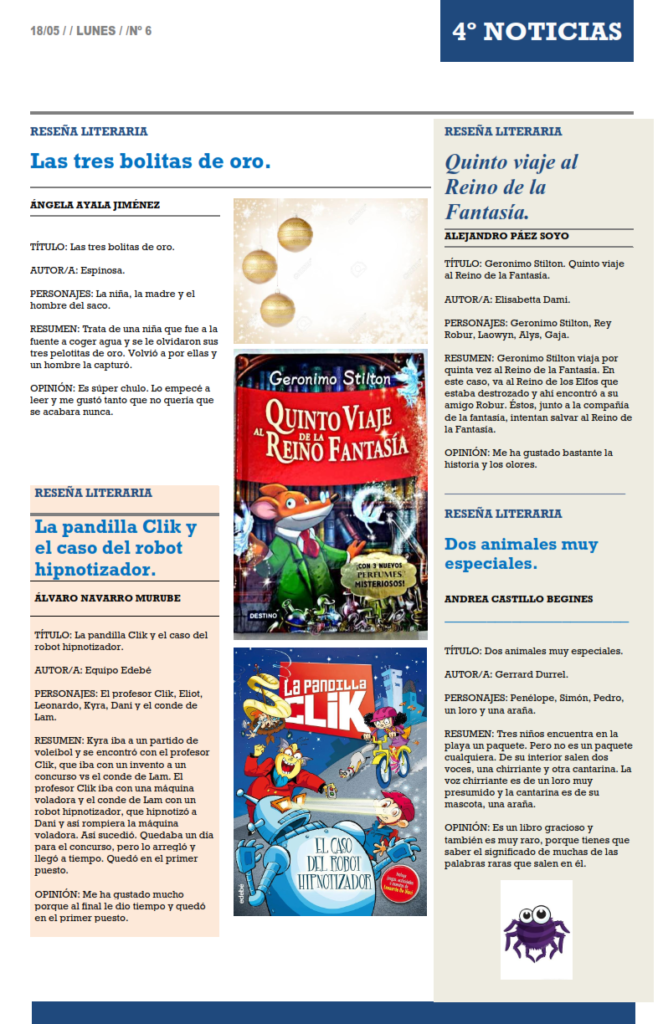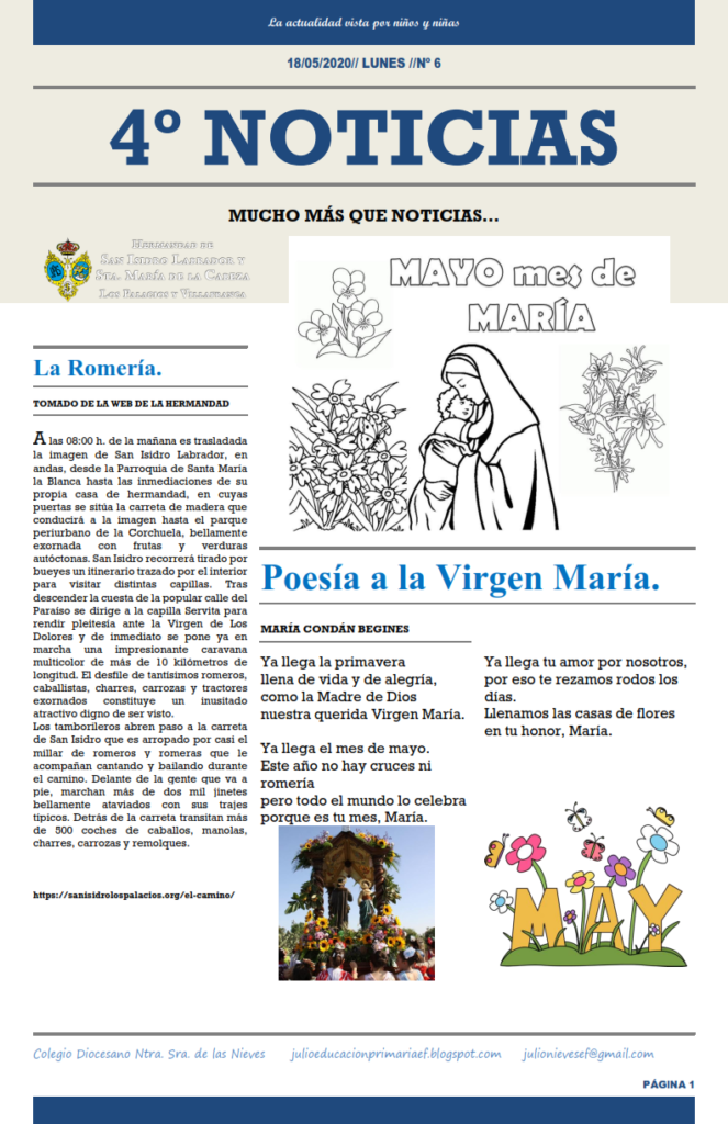 Esta actividad fomenta la práctica de algo tan importante como la expresión escrita, además de otros aspectos como el uso de las tecnologías (envían sus trabajos a través de diferentes medios tecnológicos, escriben algunas noticias en Word, buscan imágenes online,…), compartir sus producciones con el resto de la comunidad educativa (se realiza una publicación  digital que se comparte con las familias y los demás compañeros/as), se posibilita de alguna manera el contacto entre los niños/as en un período de confinamiento, así como poder expresar sus ideas, opiniones o sentimientos, lo que puede ser muy saludable en estos momentos.