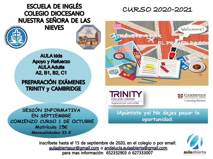 Inscríbete hasta el 25 de septiembre de 2020, en el colegio o por email: aulaabiertasur@gmail.com o andalucia.aulaabierta@gmail.com.