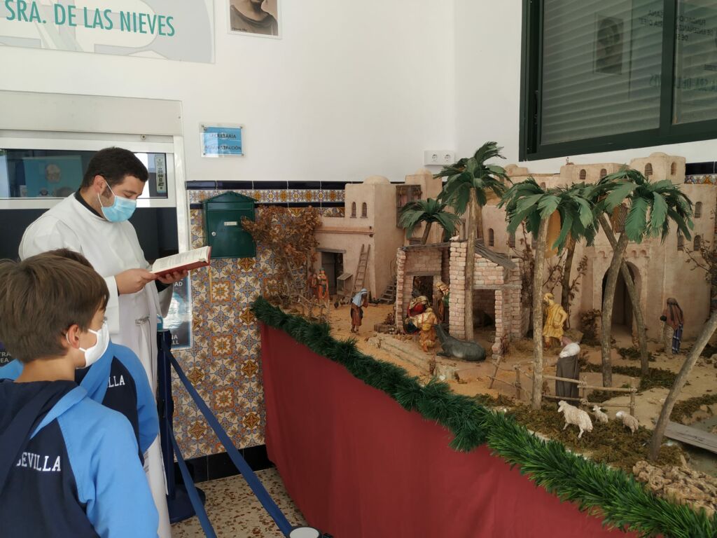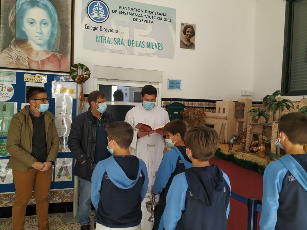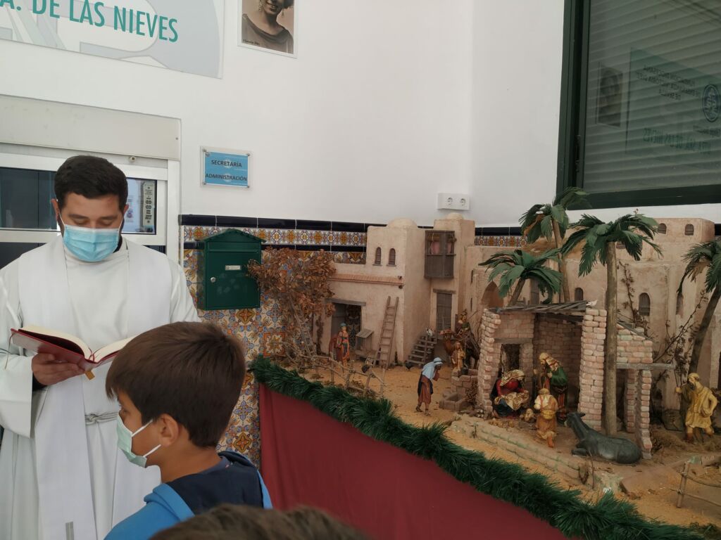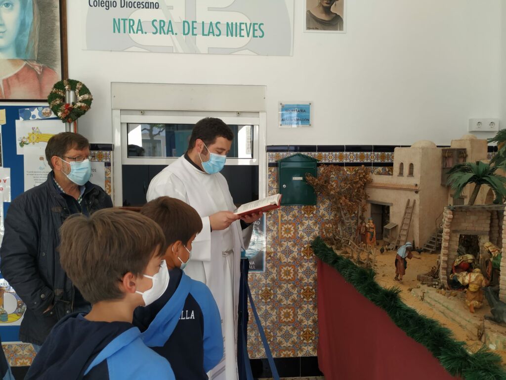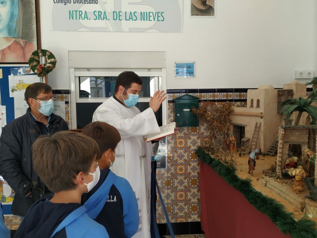 Ayer, lunes 13 de diciembre, varios monaguillos, el responsable de liturgia y el Director del Colegio Diocesano Ntra. Sra. de las Nieves se han reunido en el hall del centro para asistir a la Bendición del Nacimiento y del Árbol de Navidad, impartida por el Vicario Parroquial D. Pedro Elena García.