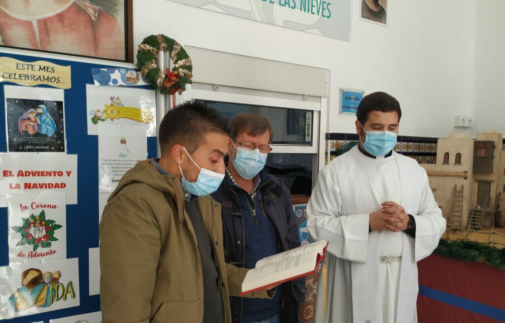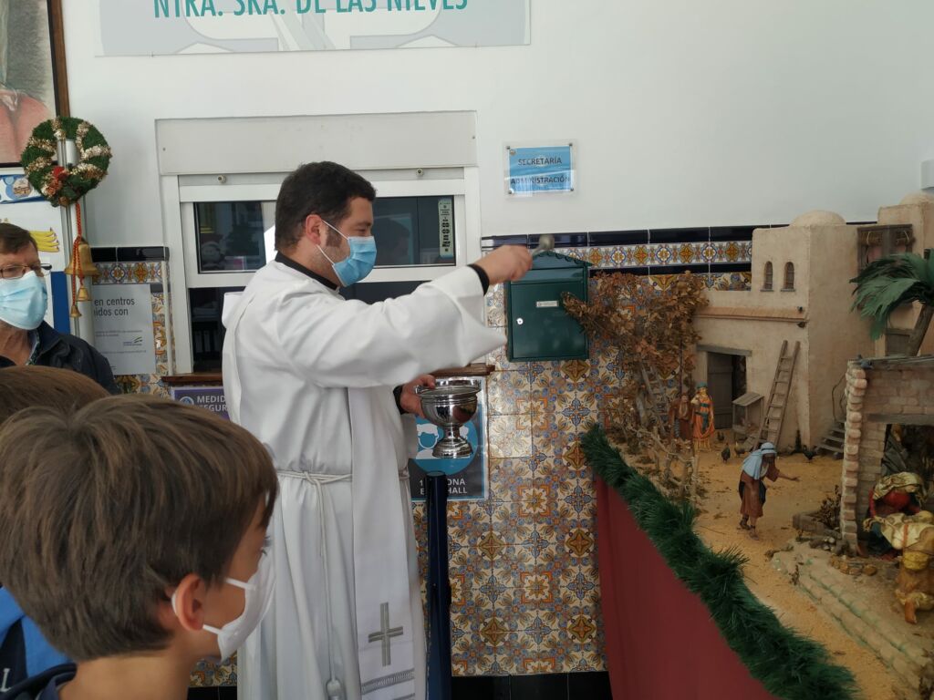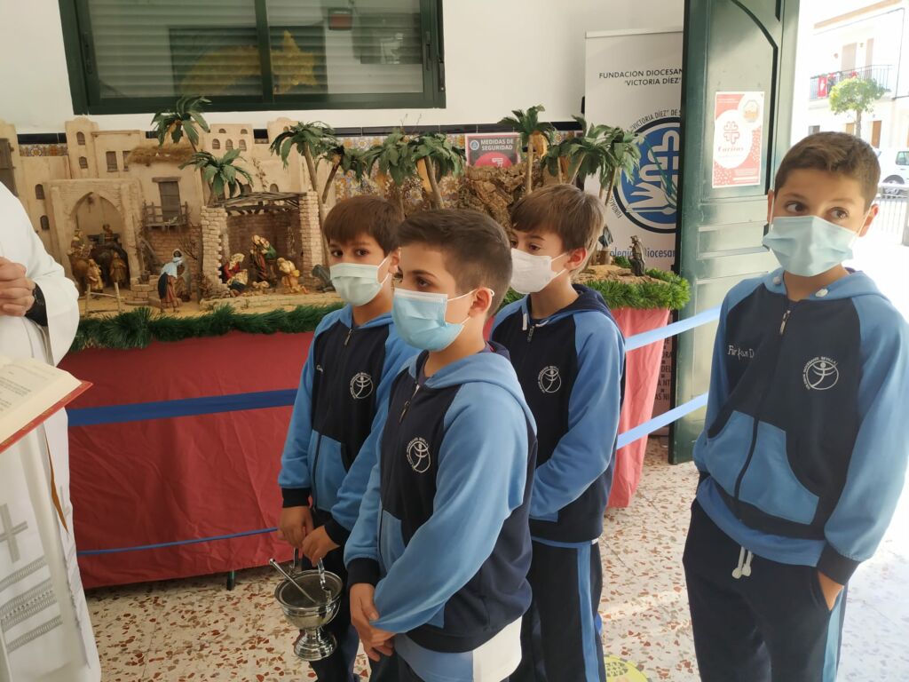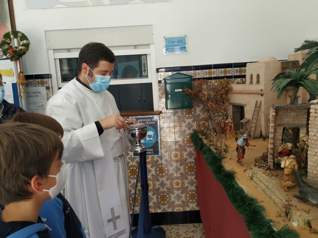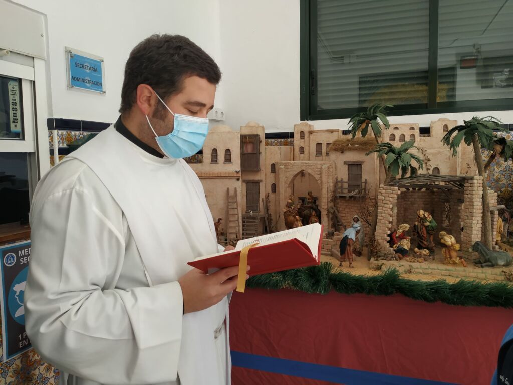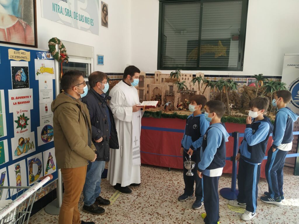 Ayer, lunes 13 de diciembre, varios monaguillos, el responsable de liturgia y el Director del Colegio Diocesano Ntra. Sra. de las Nieves se han reunido en el hall del centro para asistir a la Bendición del Nacimiento y del Árbol de Navidad, impartida por el Vicario Parroquial D. Pedro Elena García.