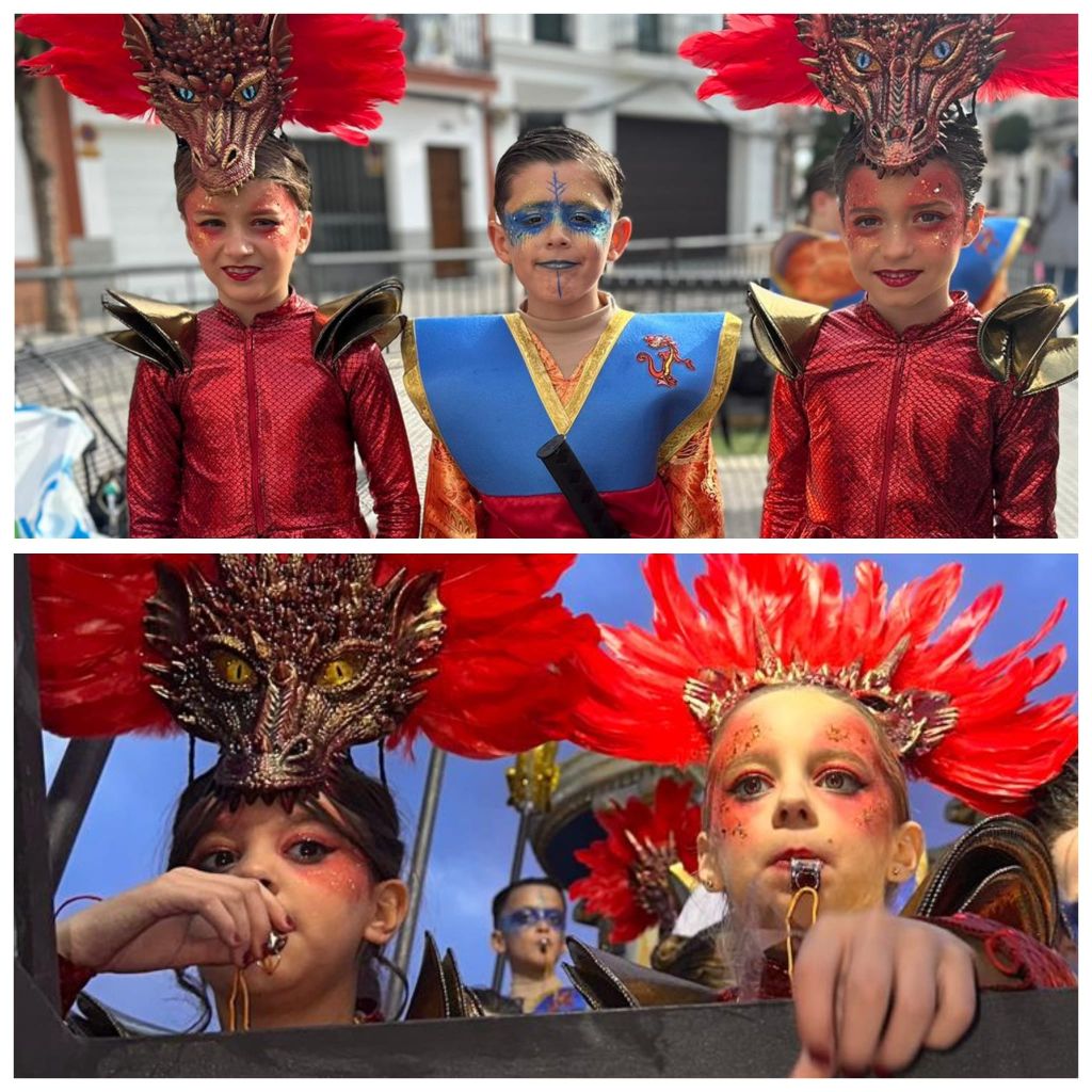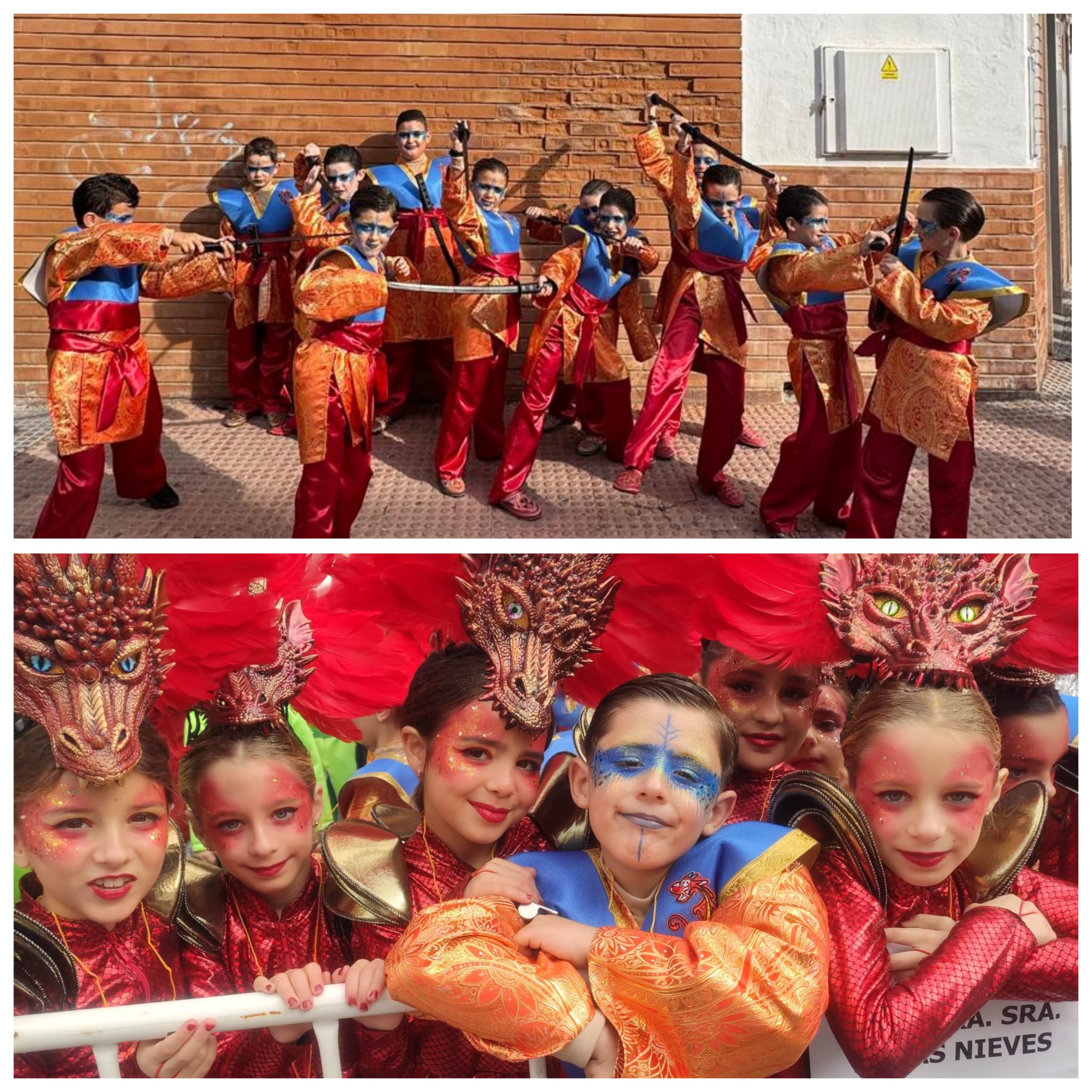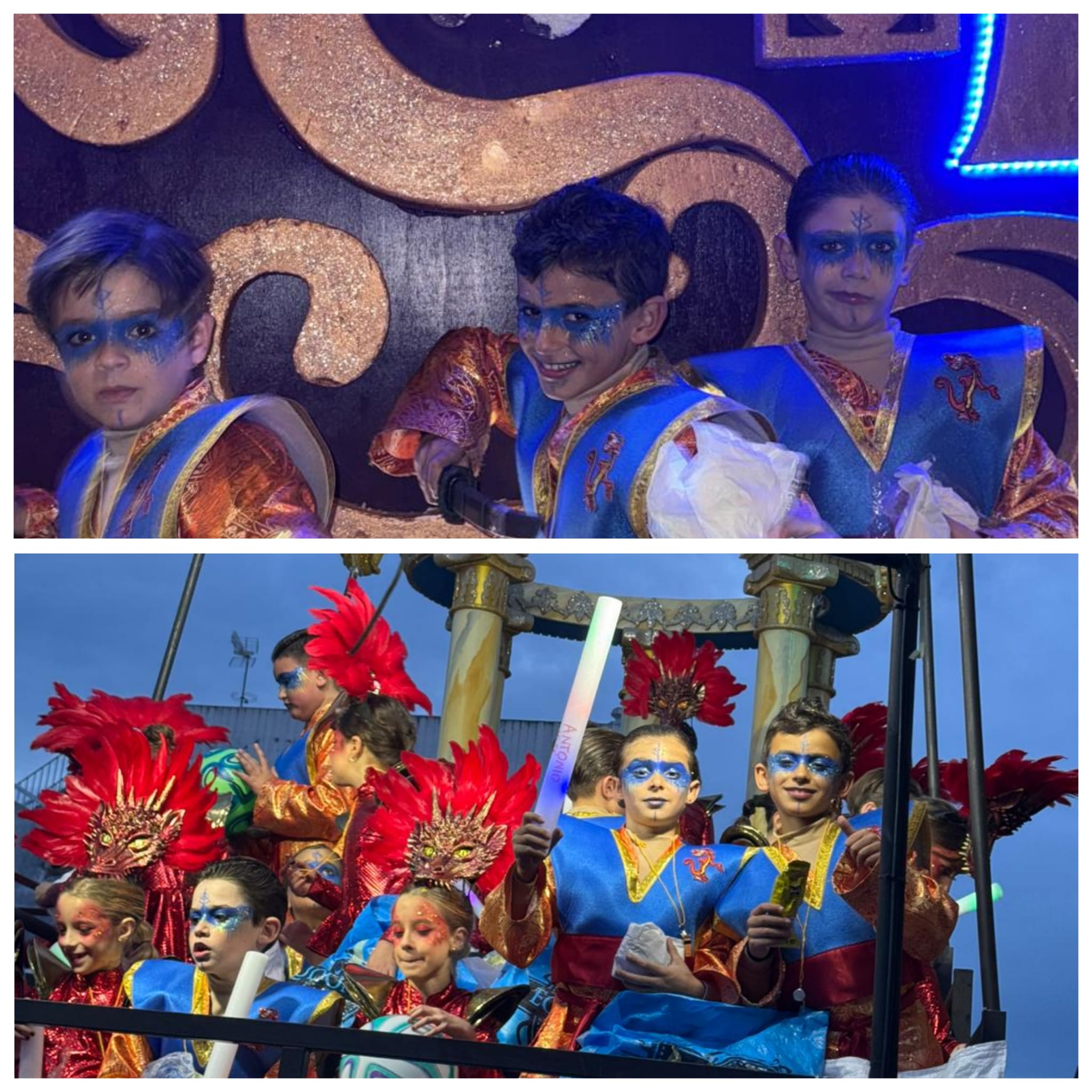 Seguidamente, se abría paso por nuestras calles la carroza: “La Antigua Grecia”, cargada con los balones, los caramelos (bolsas de papel reciclado) y la ilusión que llevaban los alumnos de 3º de Primaria de nuestro Centro. Concretamente aprovechando las columnas de la carroza nos hemos inspirado en la película Mulán, cuando ella va con su padre, al templo de columnas, a ver a los ancestros.