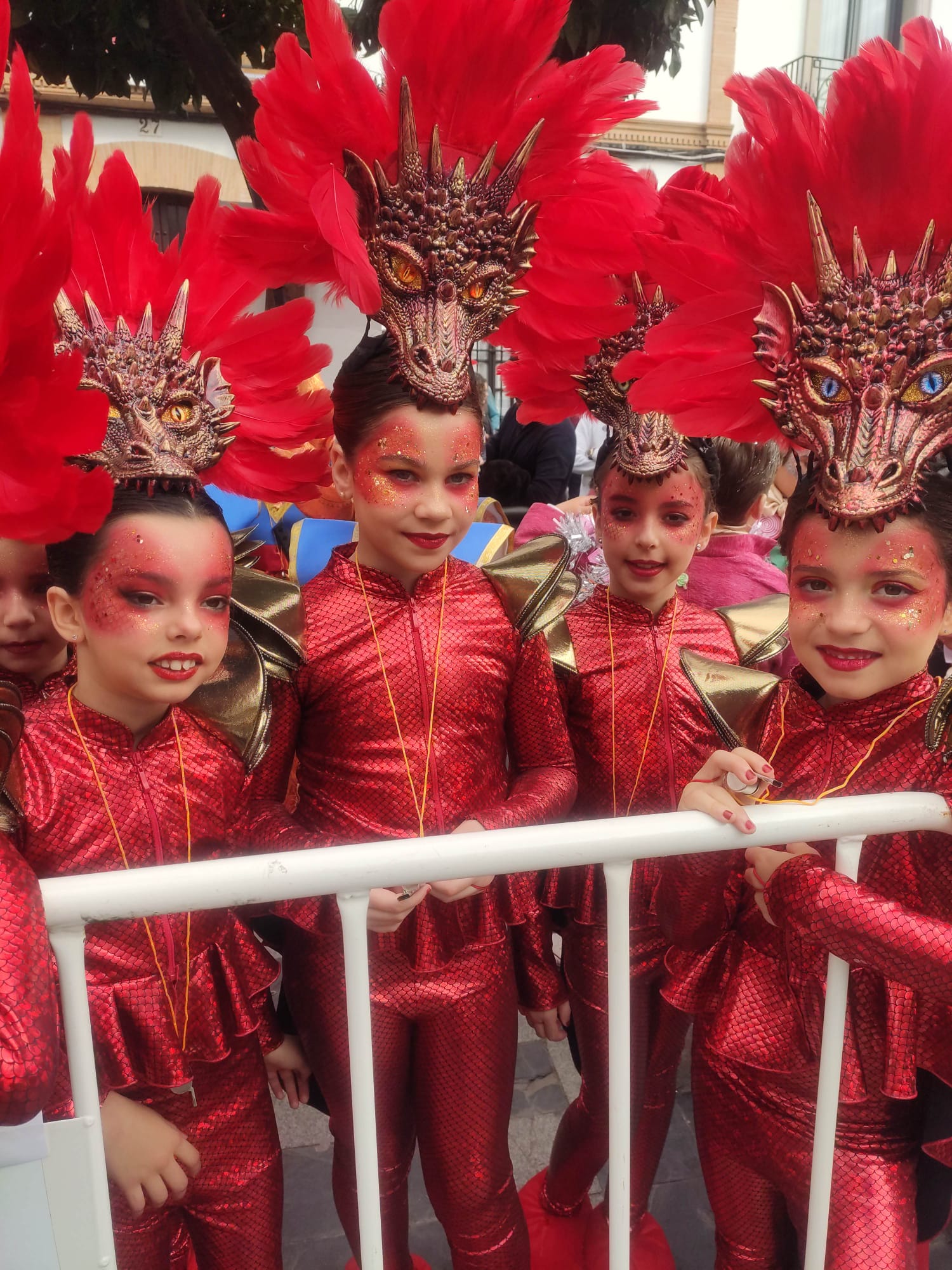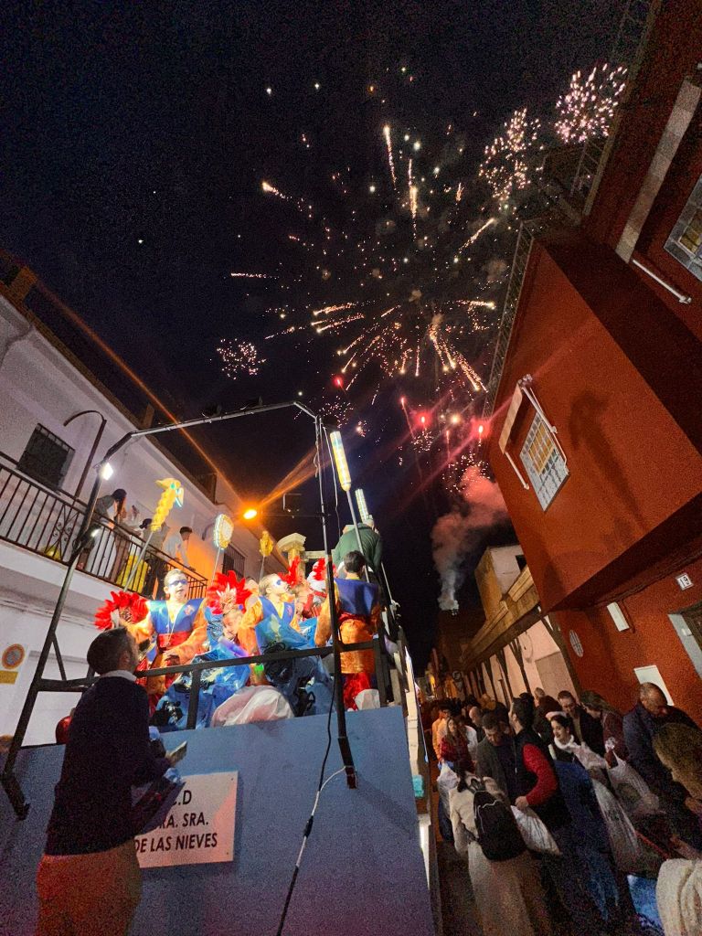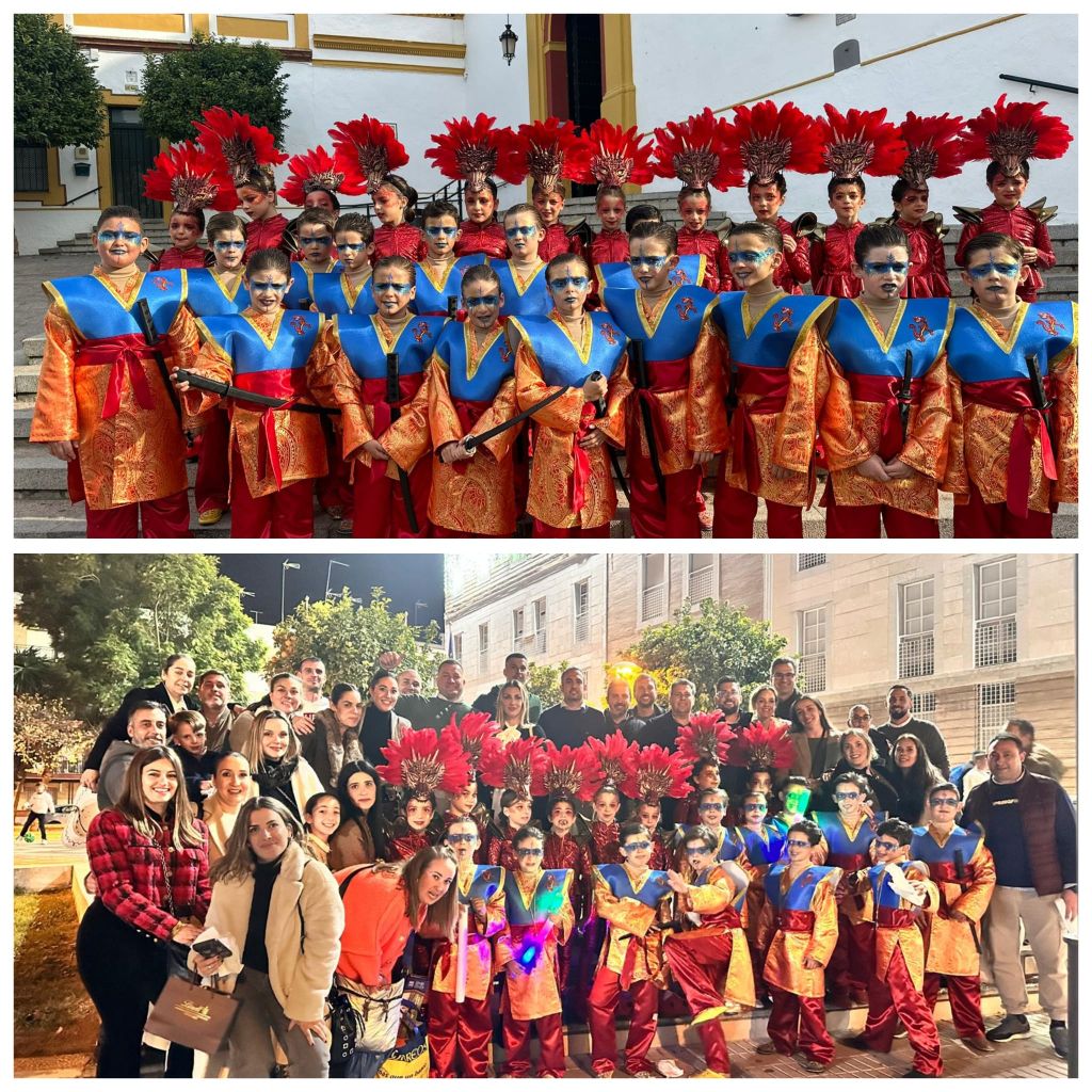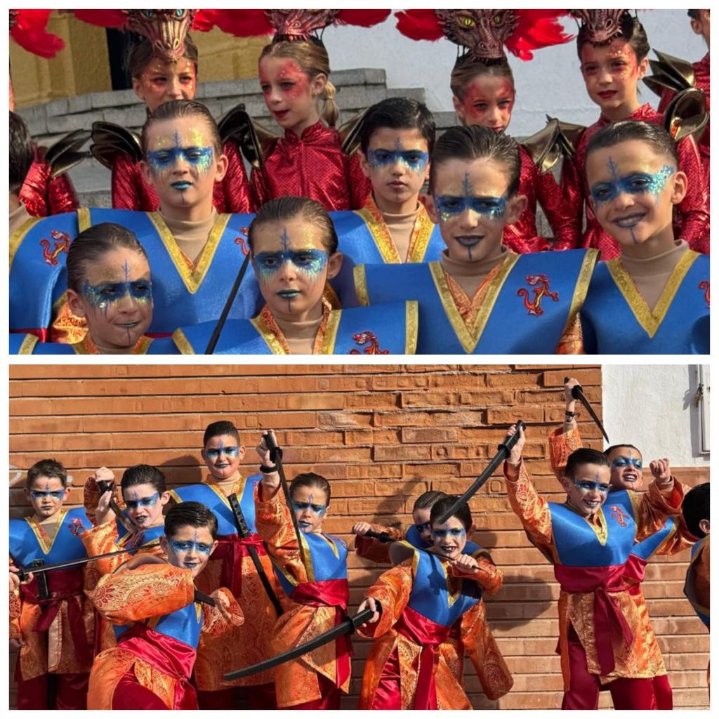 Seguidamente, se abría paso por nuestras calles la carroza: “La Antigua Grecia”, cargada con los balones, los caramelos (bolsas de papel reciclado) y la ilusión que llevaban los alumnos de 3º de Primaria de nuestro Centro. Concretamente aprovechando las columnas de la carroza nos hemos inspirado en la película Mulán, cuando ella va con su padre, al templo de columnas, a ver a los ancestros.