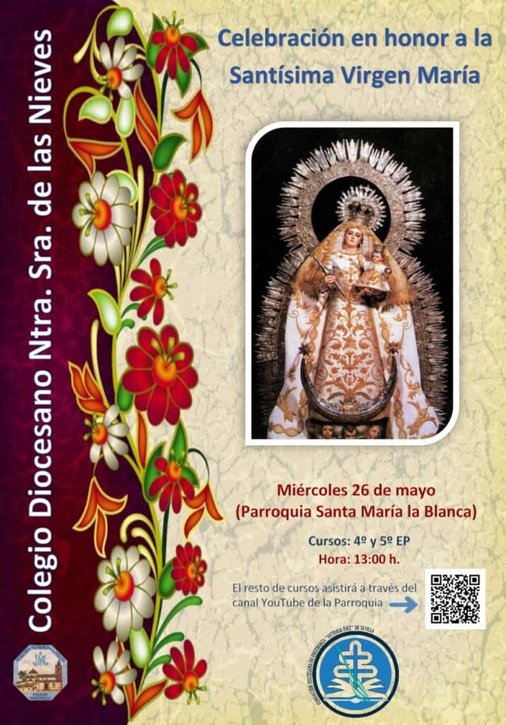 Mañana, miércoles 26 de mayo, a la 13:00 h., nuestra Comunidad Educativa celebrará una Eucaristía, en honor a la Santísima Virgen María, en la Parroquia Mayor de Santa María la Blanca cumpliendo con las medidas sanitarias.