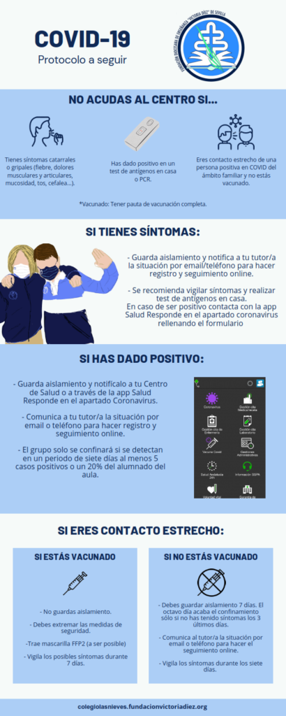 Aquellos alumnos que presenten síntomas compatibles con la enfermedad deben permanecer en casa hasta descartar que sea COVID y aquellos que sean contactos estrechos deben comunicarlo a los tutores o al centro, ya que el confinamiento o no de dichos alumnos dependerá de algunos criterios que deben ser valorados por el coordinador COVID y la enfermera de referencia de nuestro centro.