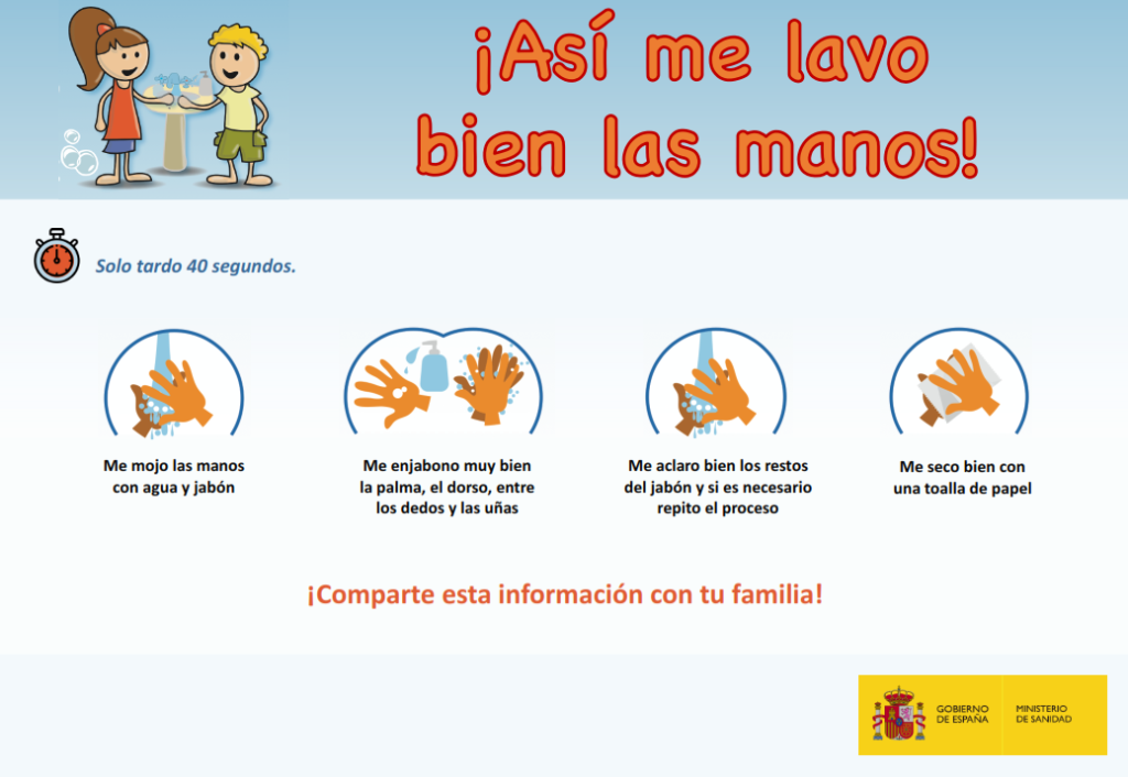 El cartel hace énfasis en cómo lavarse las manos, con el fin de que pueda colocarse en un lugar visible al lado de los lavabos. Esto, junto a la disponibilidad de jabón y papel para el secado de las manos, es una medida para colaborar entre todos al cumplimiento de las acciones preventivas por la población infantil.