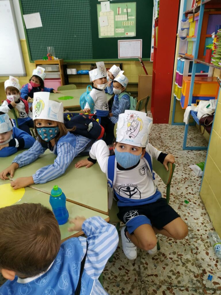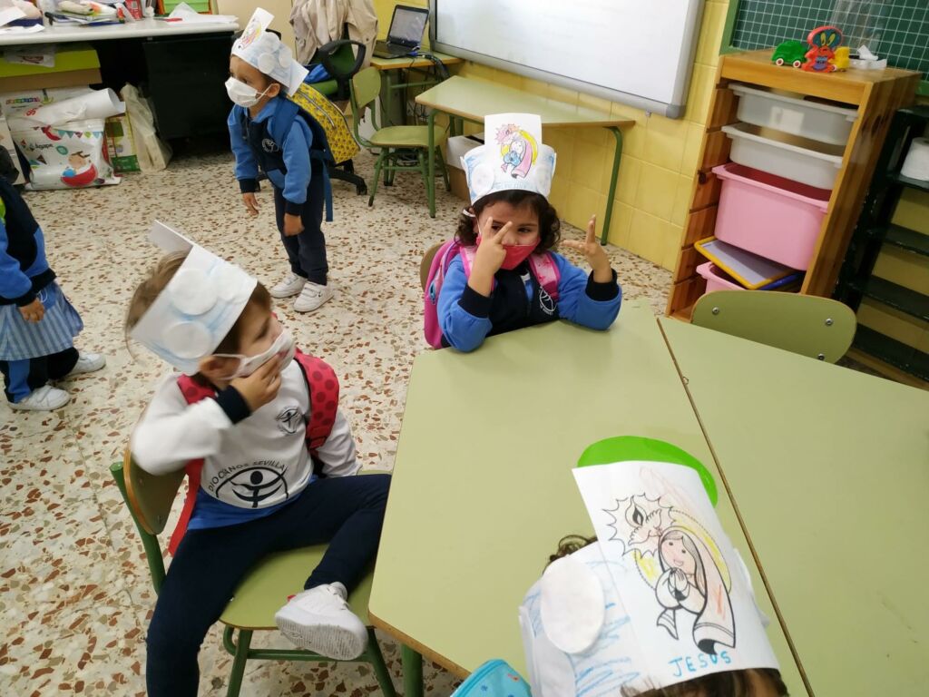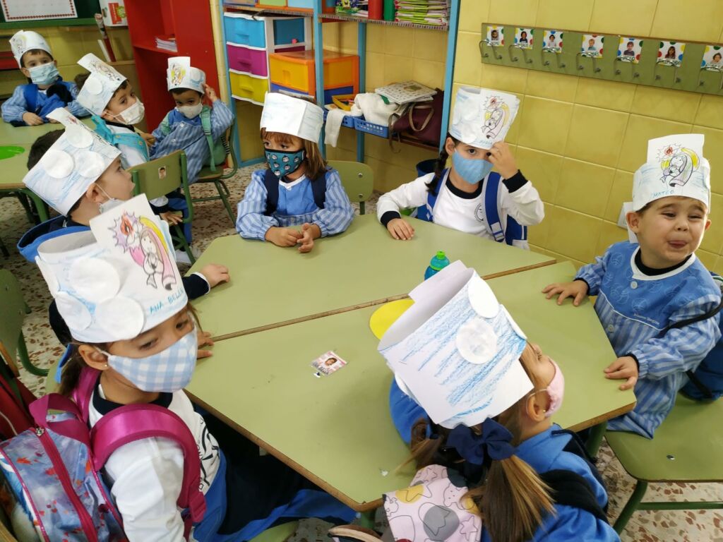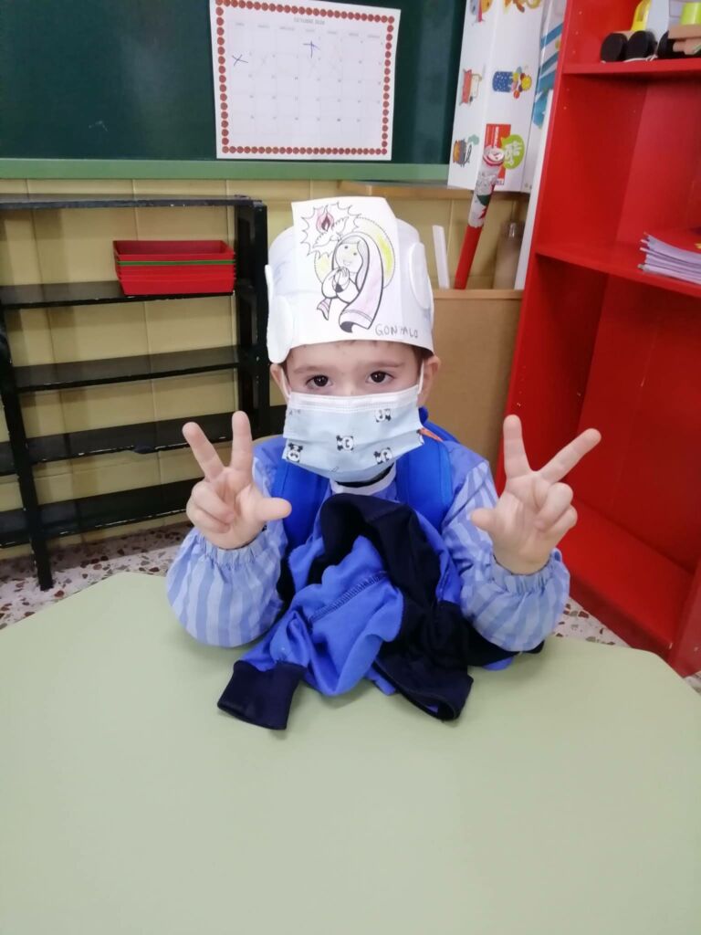 Con la ayuda de las profesoras, los alumnos de Educación Infantil (3 años) han realizado una “Corona de Santos”: Para ello, haciendo uso de una tira alargada de cartulina blanca y un lápiz de color azul, los alumnos han coloreado el cielo como base de la corona, a continuación han pegado con cola y/o pegamento a la cartulina, unos discos desmaquillantes de algodón, simulando estos las nubes del cielo. Por último, tras pegar una imagen de la Santa Virgen niña en el centro de la corona, han utilizado diferentes lápices para colorearla.