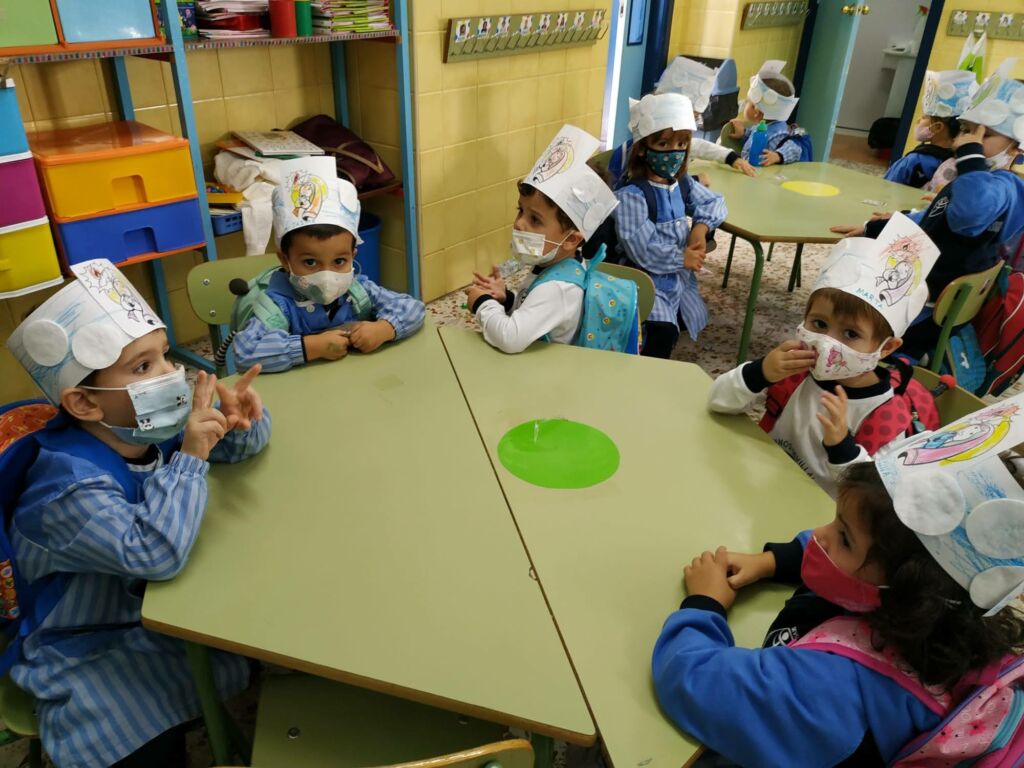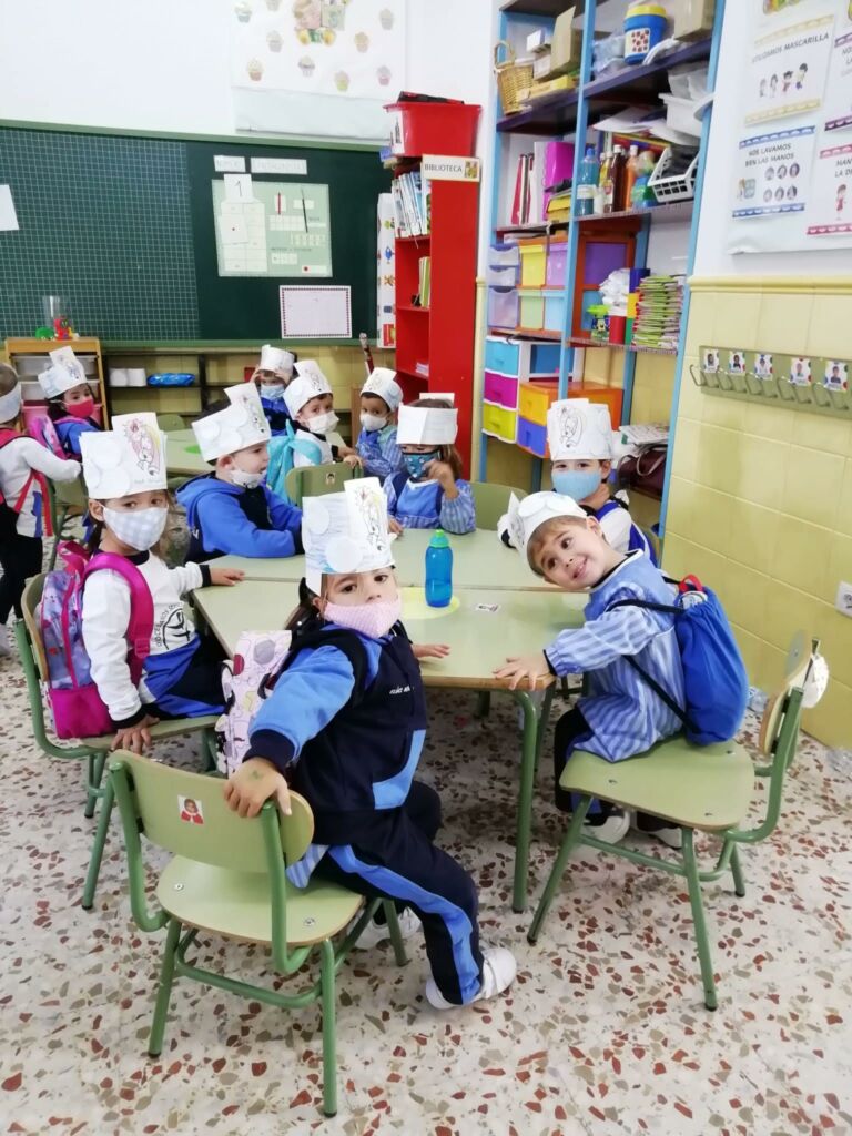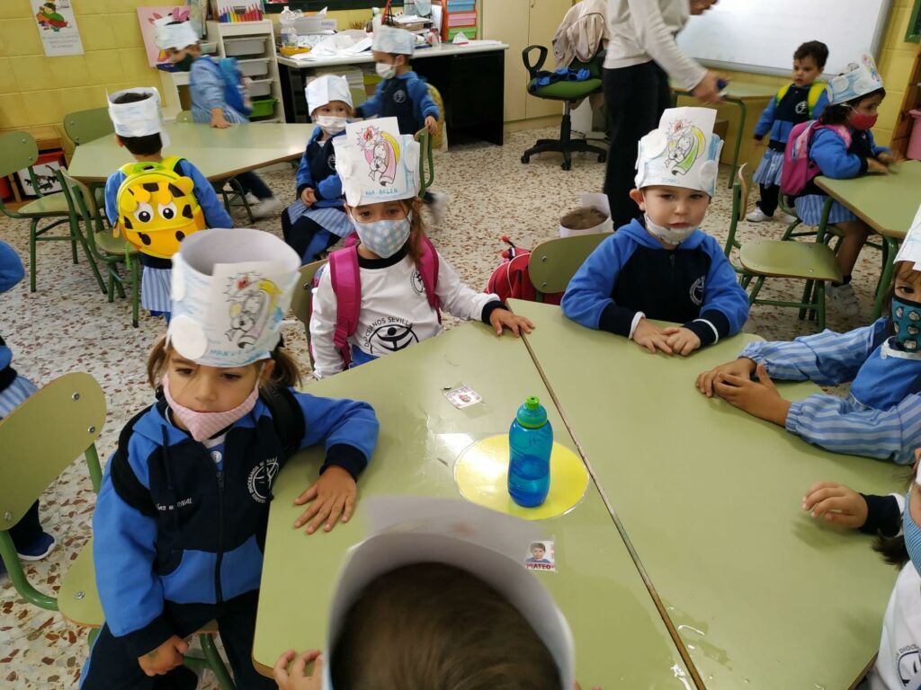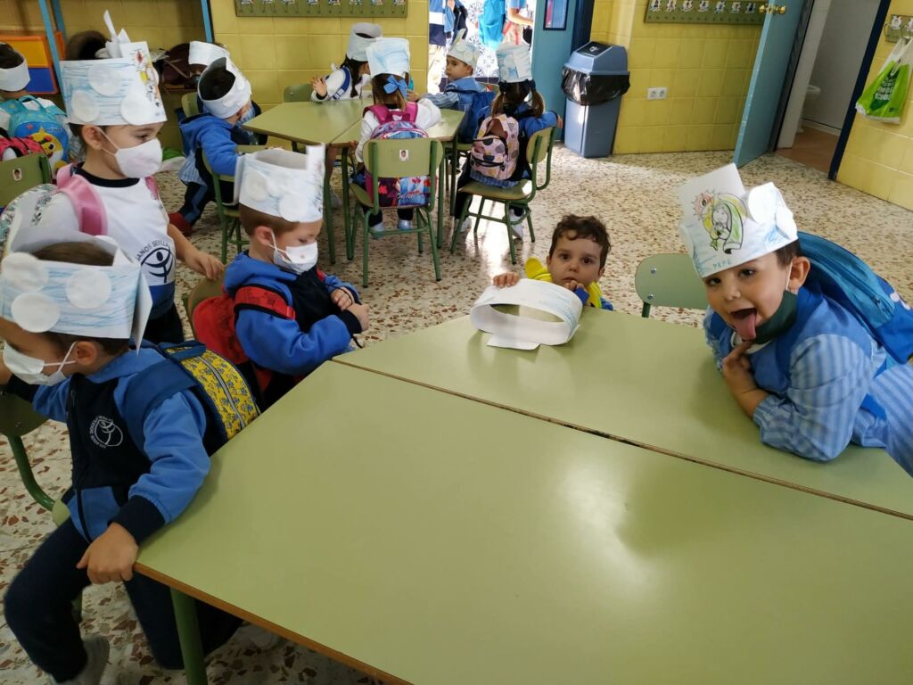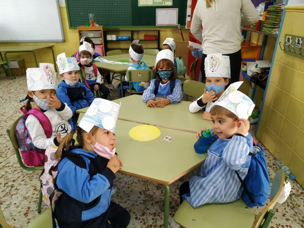 Con la ayuda de las profesoras, los alumnos de Educación Infantil (3 años) han realizado una “Corona de Santos”: Para ello, haciendo uso de una tira alargada de cartulina blanca y un lápiz de color azul, los alumnos han coloreado el cielo como base de la corona, a continuación han pegado con cola y/o pegamento a la cartulina, unos discos desmaquillantes de algodón, simulando estos las nubes del cielo. Por último, tras pegar una imagen de la Santa Virgen niña en el centro de la corona, han utilizado diferentes lápices para colorearla.