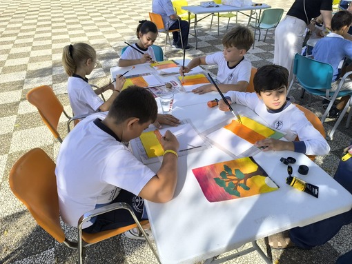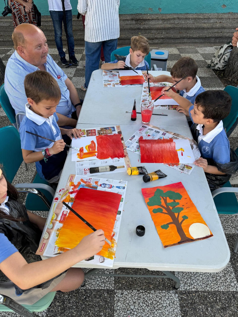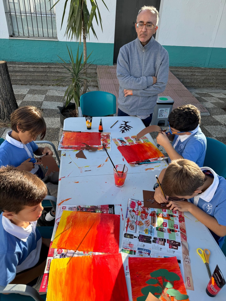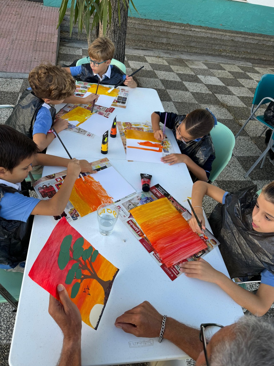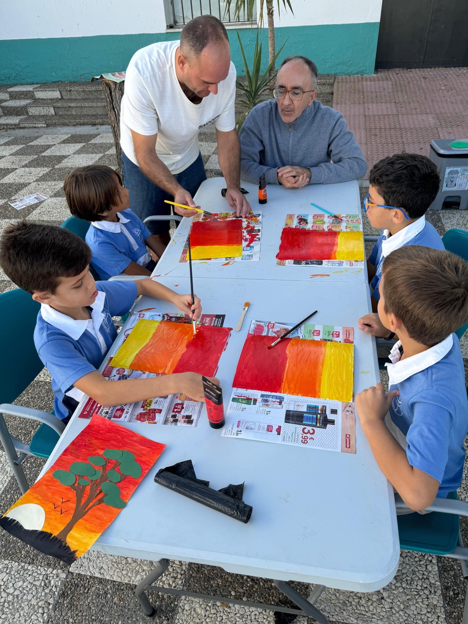 En esta ocasión, la actividad compartida entre niños y usuarios ha sido la realización de una pintura. Precisamente, Ricardo, usuario del Centro les explicaba que la pintura es una tarea que le gusta practicar, que le ayuda a tener la mente ocupada y expresar, a través de ella, sus emociones y estados de ánimo. El propio Ricardo expresaba como buena y terapéutica su experiencia en el Centro Social Los Palacios, y gracias a las diferentes ocupaciones y talleres que les programan a diario, teatro, cocina, huerto, manualidades…