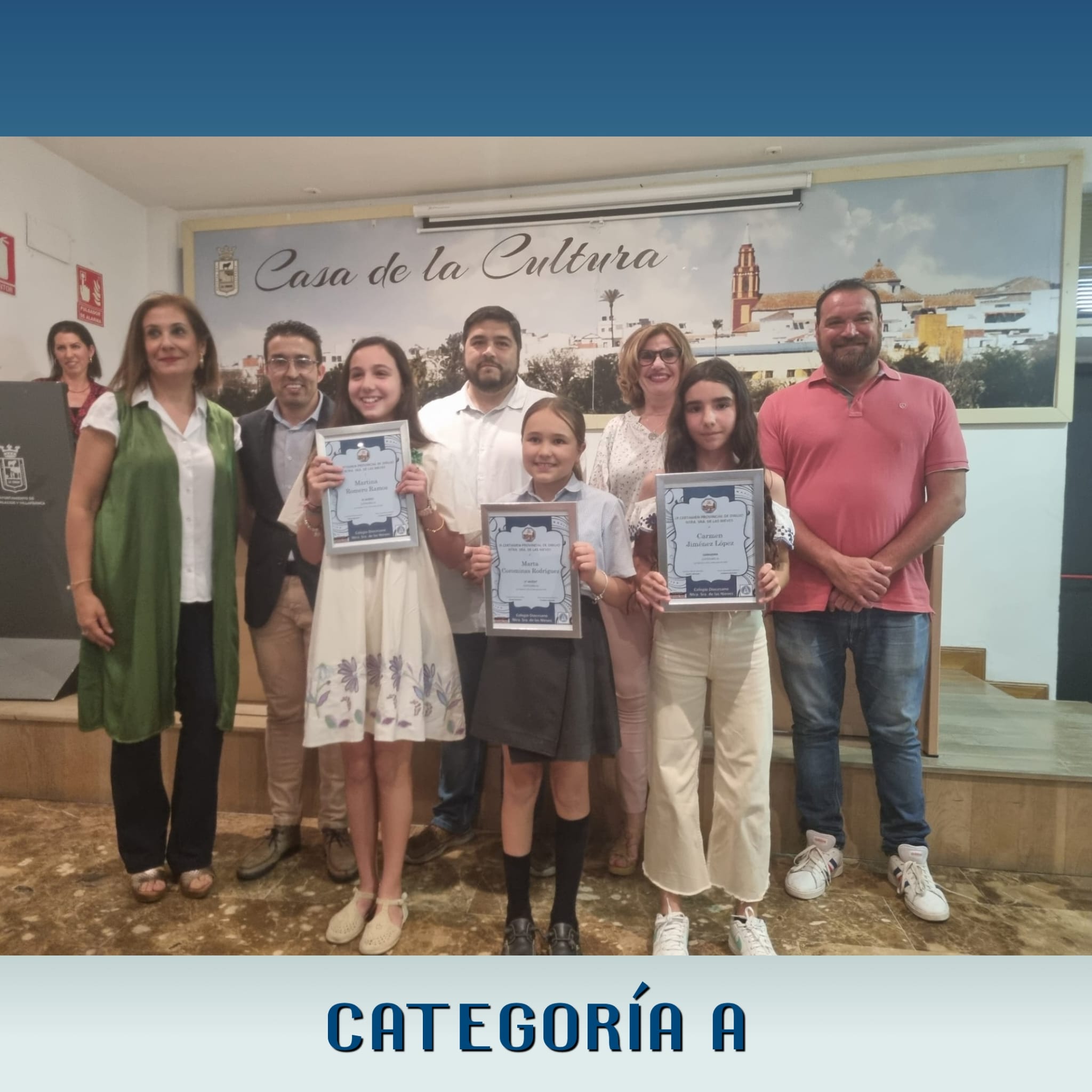 En categoría A, alumnos que cumplen 10, 11 y 12 años, el tercer puesto fue para la obra “En el país de las maravillas” de Martina Romero Ramos; en segundo lugar quedó la obra “Un verano caluroso” de Marta Coromina Rodríguez; y la ganadora, con el primer puesto, dotado con 50 euros para canjear por material escolar, ha sido la obra de Carmen Jiménez López, del colegio Juan José Baquero, titulada “Representación”.
