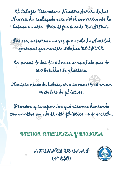 Invitamos a la Comunidad Educativa de nuestro Centro a que se fotografíen junto a nuestro Árbol y envíen sus instantáneas (nombre del alumno/a y curso) a la siguiente dirección: administracion@colegiolasnieves.diocesanossevilla.es