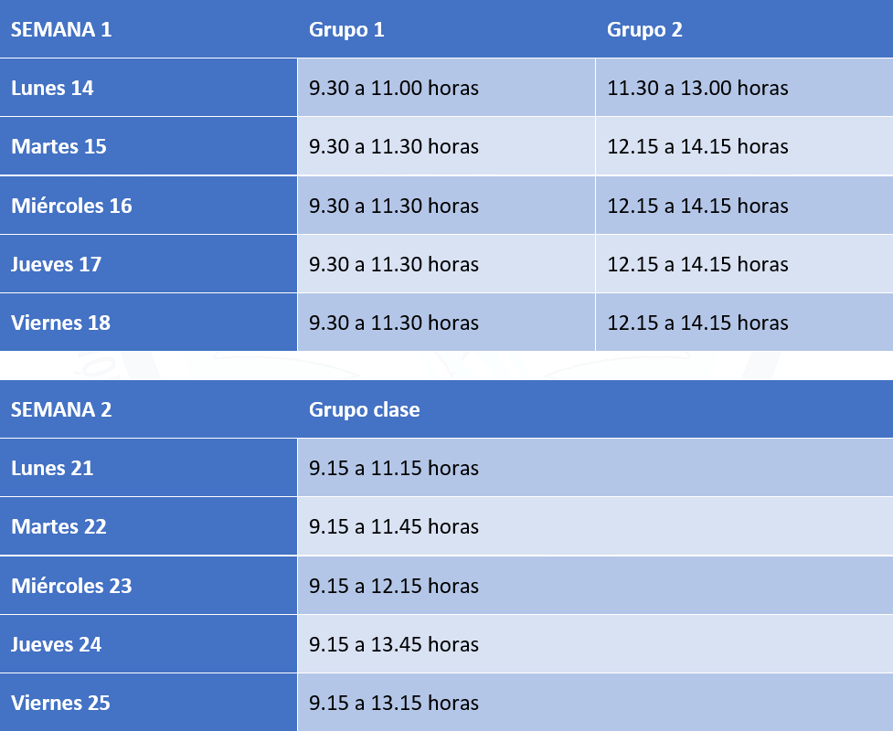 ⇒ A partir del lunes 28 el horario para todos los alumnos será de 9.15 a 14.15 horas.