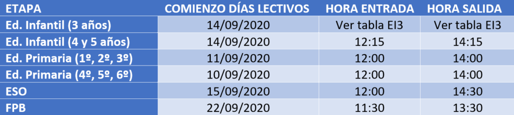 ⇒ Se especifica, a continuación, el horario del primer día lectivo del curso 2020/2021, diferenciado por etapas: