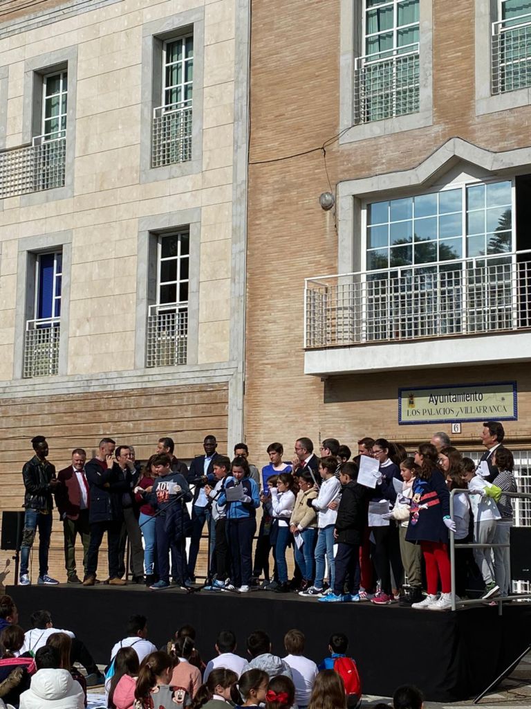 A las 12 de la mañana llegaba la Marcha a las puertas del Ayuntamiento, allí los alumnos y profesores eran recibidos por miembros del gobierno municipal encabezado por el alcalde palaciego, Juan Manuel Valle. En este acto institucional también participaron miembros de Madiba, además de Alfonso Escribano, Presidente de la Confederación Andaluza de Federaciones Deportivas; María Luisa Gómez, Delegada del Distrito Sur de Sevilla; Rafael Gordillo, Presidente de la Fundación Real Betis Balompié y el jugador palaciego del Sevilla F.C., Jesús Navas, entre otros.