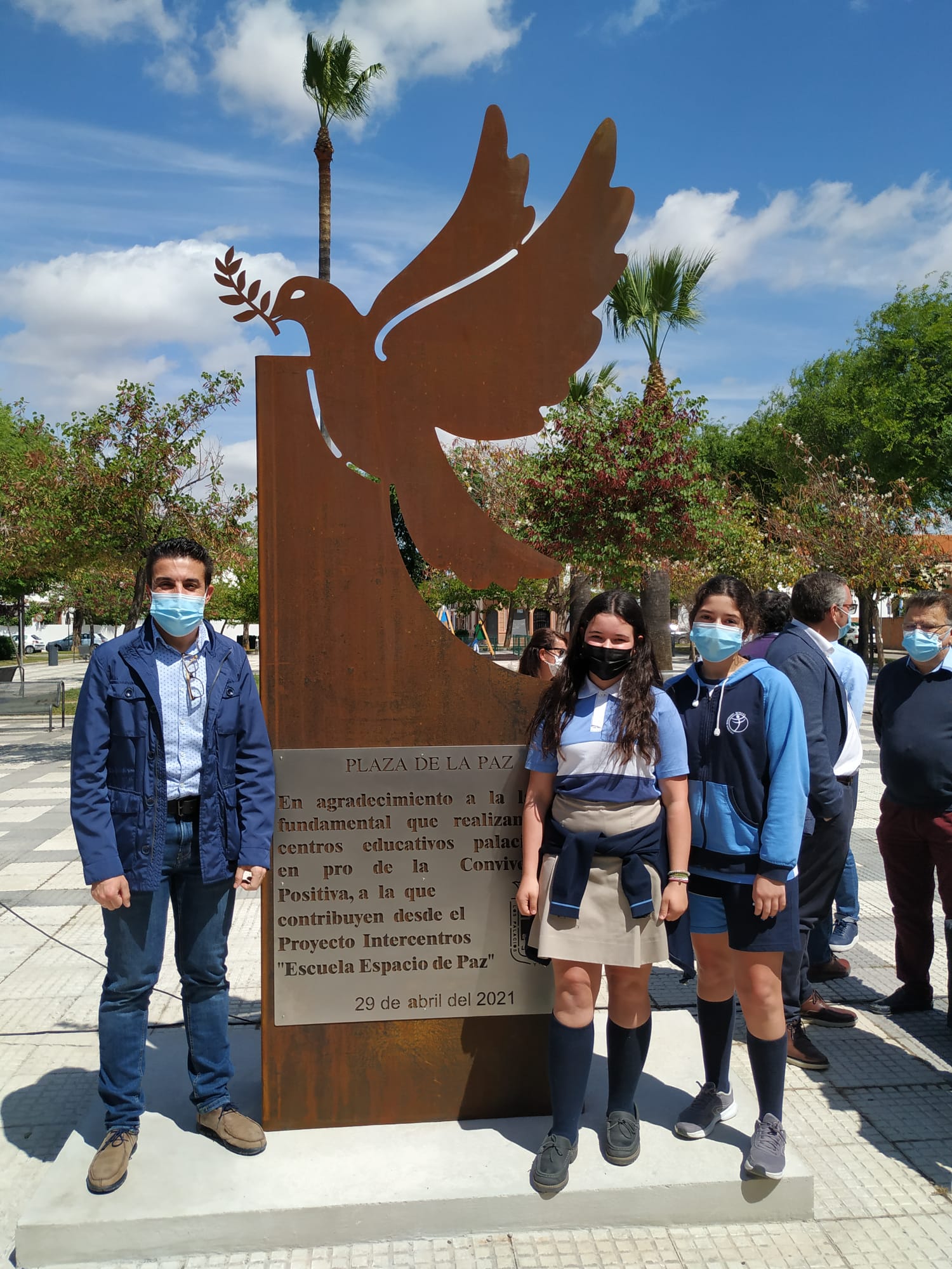 Se trata del descubrimiento de una escultura con la representación de la Paloma de la Paz, realizada por la empresa local ICM, en acero corten. Un monumento de tres metros de altura por uno de ancho, inaugurado por el alcalde, el delegado de educación y las dos ganadoras del Certamen Literario por la Paz convocado por el Colegio María Auxiliadora, que, desde hoy, da nombre a la Plaza de la Paz y que supone un agradecimiento público a la comunidad educativa palaciega por la labor que realiza a diario en pro de la buena convivencia y la cultura de la paz.