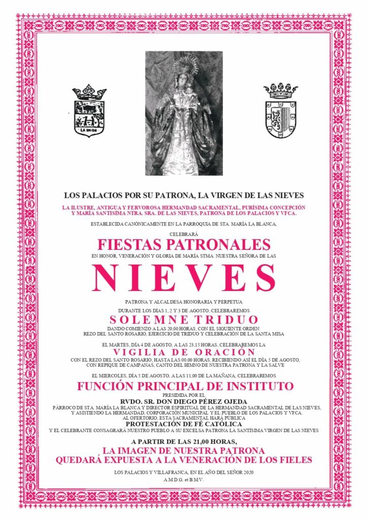 Ya el miércoles, 5 de agosto, día grande de la Virgen de las Nieves, a partir de las once de la mañana se celebrará función principal presidida por Diego Pérez Ojeda, párroco de Santa María la Blanca y director espiritual de la Hermandad Sacramental de las Nieves. Como consecuencia del COVID, el aforo será limitado, pues habrá que guardar la distancia de seguridad entre todos los que accedan a la parroquia para participar de los cultos.