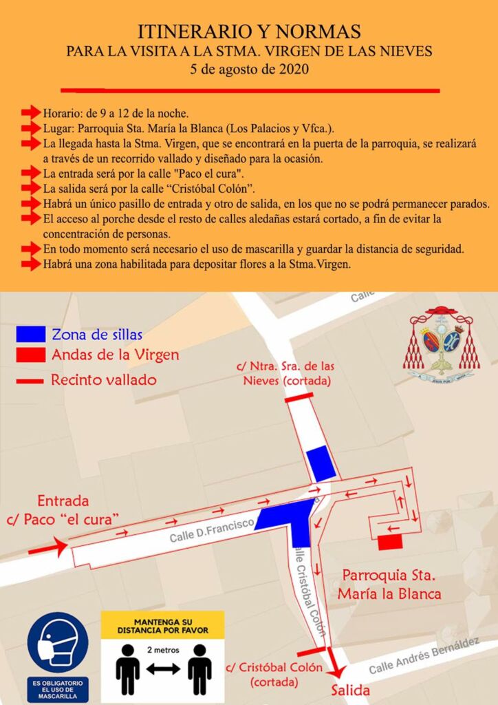 En un recinto acotado, a través de un itinerario previamente fijado, y con todas las medidas de seguridad, los asistentes podrán pasar por delante de la patrona de Los Palacios a fin de hacerle llegar sus oraciones y ofrendas florales en un día tan señalado. En todo momento se exigirá como obligatorio el uso de mascarilla, así como guardar la distancia de seguridad.