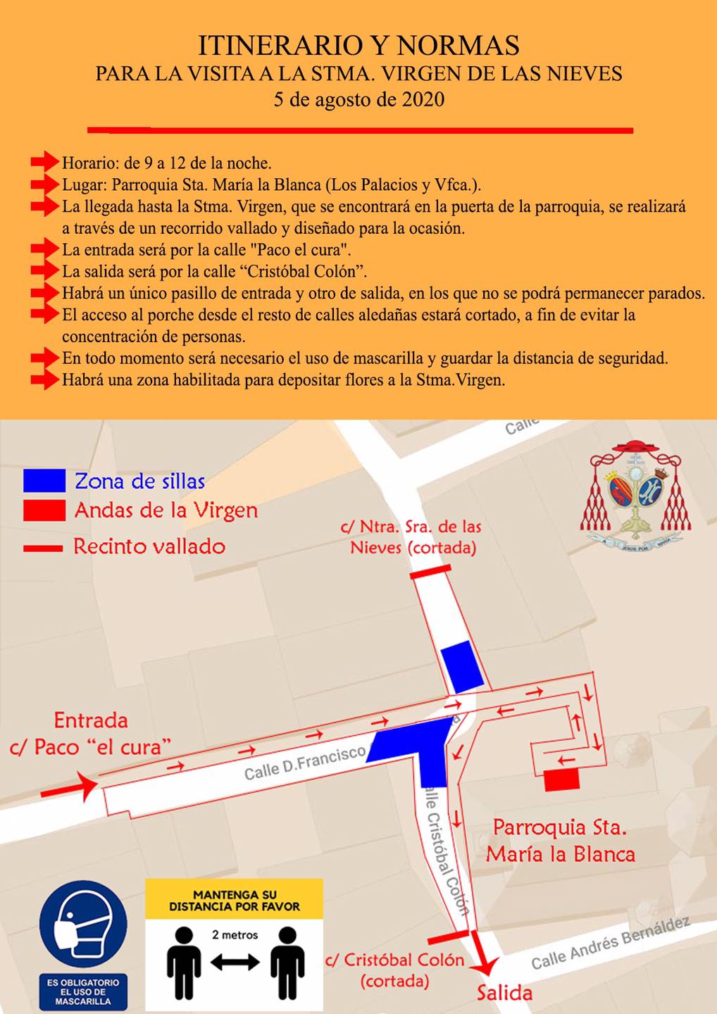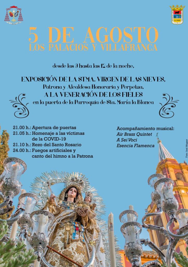 La Virgen de las Nieves permanecerá en unas andas, cedidas para la ocasión, desde las nueve de la tarde y hasta las doce de la noche, momento en el que, tras el canto del himno, y un castillo de fuegos artificiales, volverá al altar mayor de la parroquia a la espera de un nuevo 5 de agosto en el que los palaciegos puedan contemplar a la patrona procesionando por las calles de Los Palacios y Villafranca.