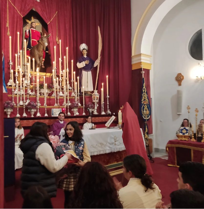 Tras finalizar la misa, el Grupo Joven de la Hermandad de la Borriquita, hizo entrega de los diplomas y premios del concurso de dibujo “Domingo de Ramos 2024”, que este año alcanza su decimoctava edición.