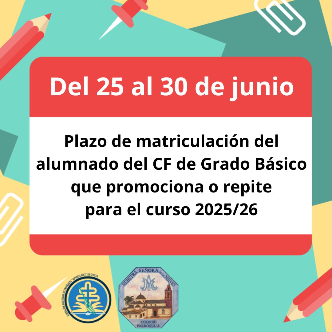 - Del 25 al 30 de junio: Matriculación del alumnado del centro que promociona o repite.