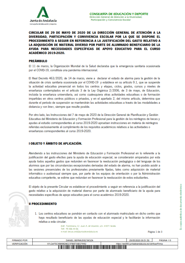 El objeto de la presente Circular es establecer el procedimiento a seguir en referencia a la justificación del gasto relativo a la adquisición de material diverso por parte de alumnado beneficiario de la ayuda para necesidades específicas de apoyo educativo para el curso académico 2019-2020.