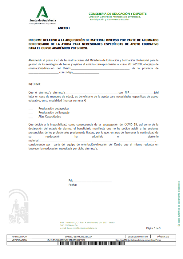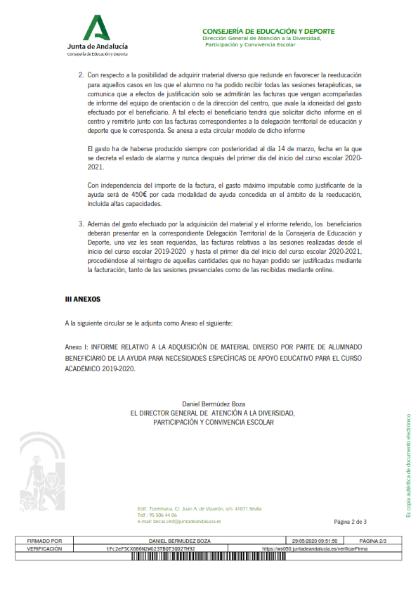Atendiendo a las instrucciones del Ministerio de Educación y Formación Profesional en lo referente a la justificación del gasto efectivo para la ayuda de educación especial, se considerarán amparados por esta ayuda todos aquellos gastos que redunden en favorecer la reeducación pedagógica o del lenguaje de los alumnos que por las circunstancias excepcionales derivadas del estado de alarma, no han podido asistir a las sesiones presenciales de los profesionales previamente fijadas, tales como adquisición de material informático o audiovisual siempre que, por parte de los equipos de orientación o por la Administración educativa competente, se estime que redundan en favorecer la reeducación de estos estudiantes.