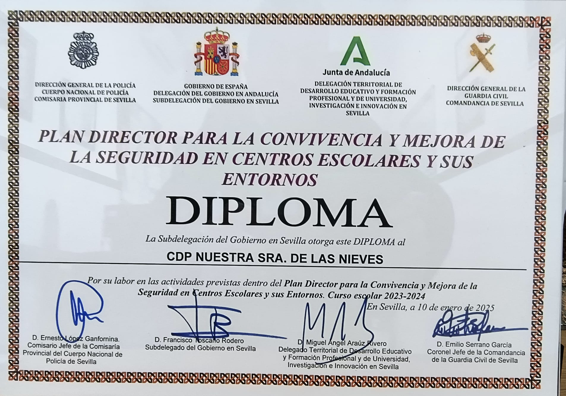 🏫🏅El Colegio Diocesano Ntra. Sra. de las Nieves, reconocido por su implicación y colaboración en el Plan Director para la Convivencia y Mejora de la Seguridad de los Centros Educativos y sus Entornos. 👮‍♂👮‍♀