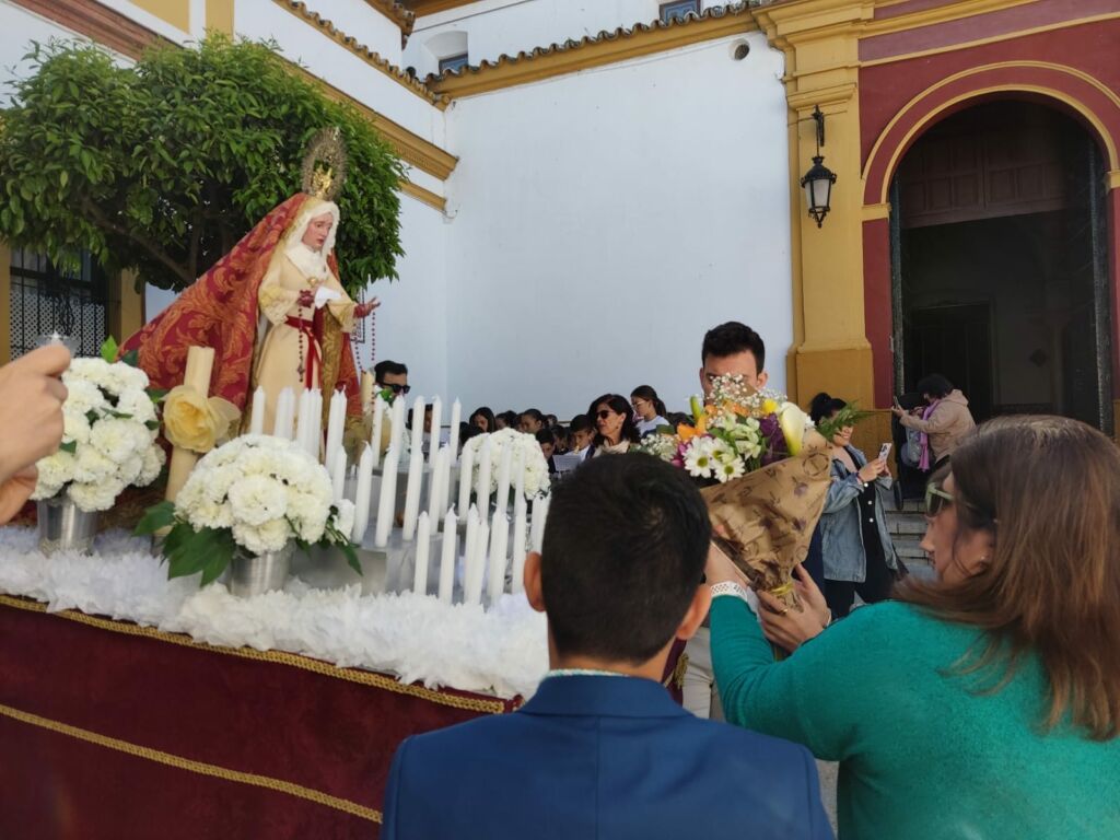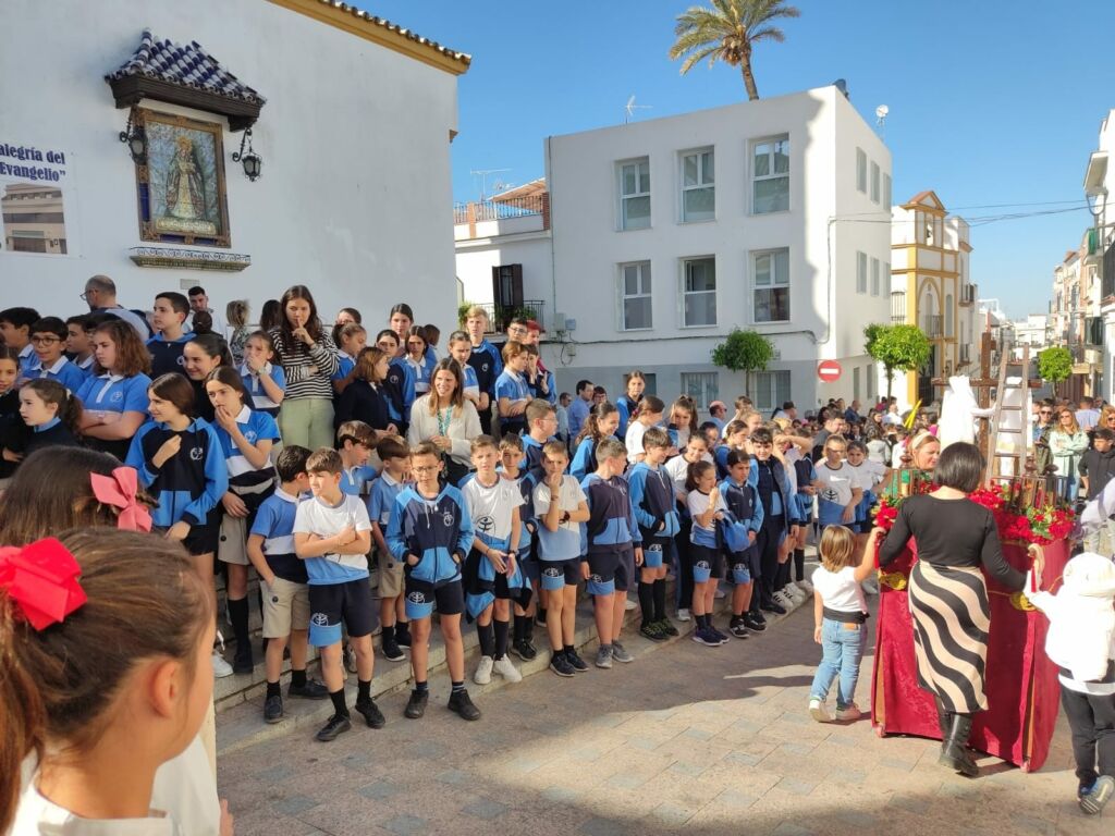 Dicha procesión pasa cada año por la fachada de nuestro colegio para realizar su estación de penitencia. En esta ocasión, la ofrenda floral, tuvo lugar en el porche la Parroquia.