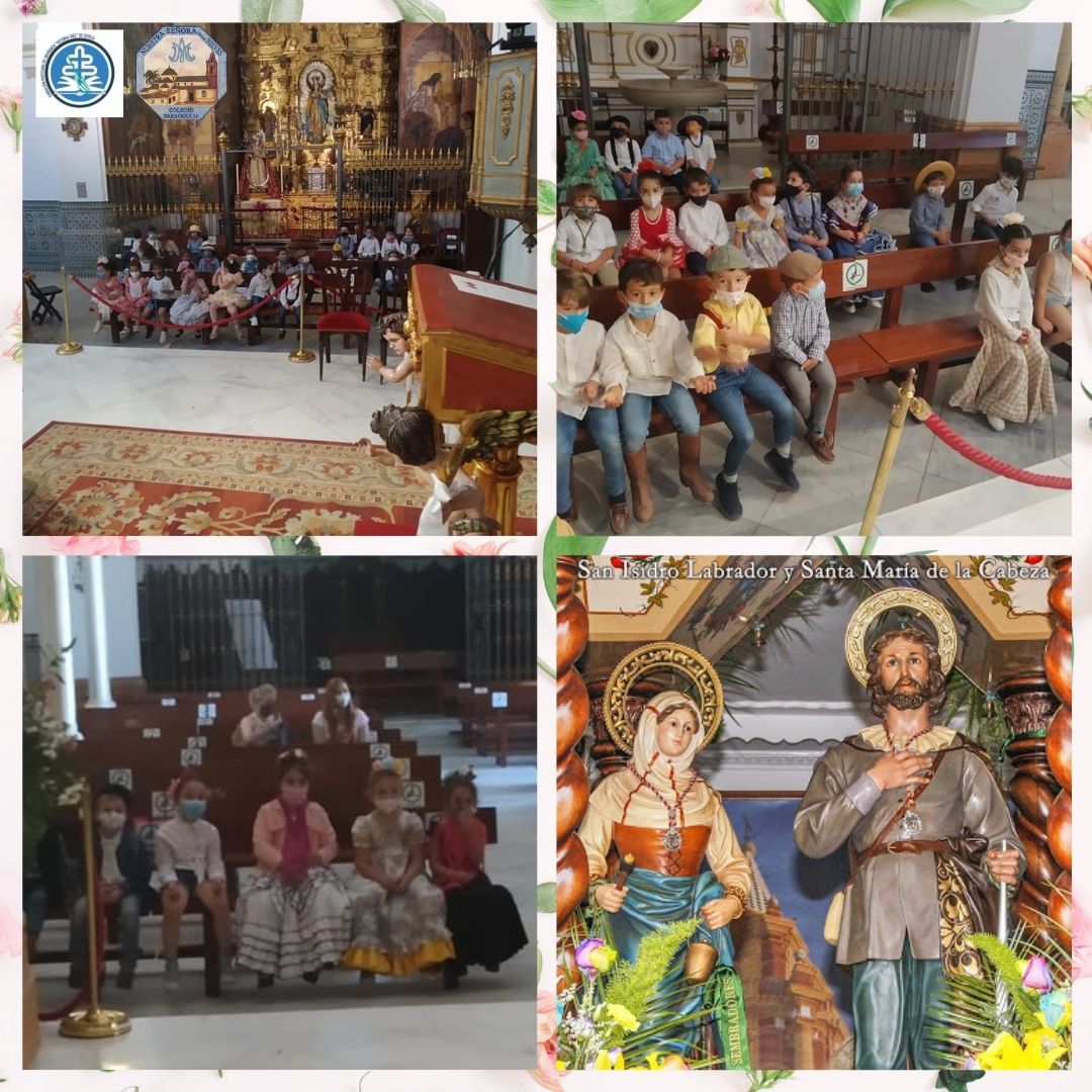 Como «regalo» para los titulares, nuestro alumnado de Ed. Infantil y 1º EP, cumpliendo con las medidas sanitarias, ha visitado la Parroquia Santa María la Blanca para rezar, cantar y realizar una ofrenda floral a San Isidro Labrador y Santa María de la Cabeza.