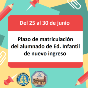 Os informamos que la matriculación del alumnado de nuevo ingreso para el próximo curso en Educación Infantil y Educación Primaria será del 25 al 30 de junio, ambos inclusive.