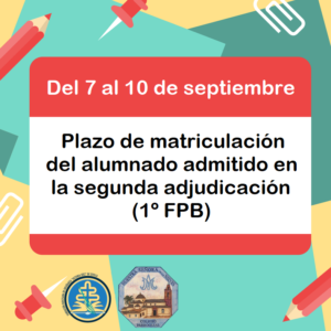 Os informamos que el plazo de matriculación del alumnado admitido en la segunda adjudicación (1º FPB) para el presente curso será del 7 al 10 de septiembre, ambos inclusive.