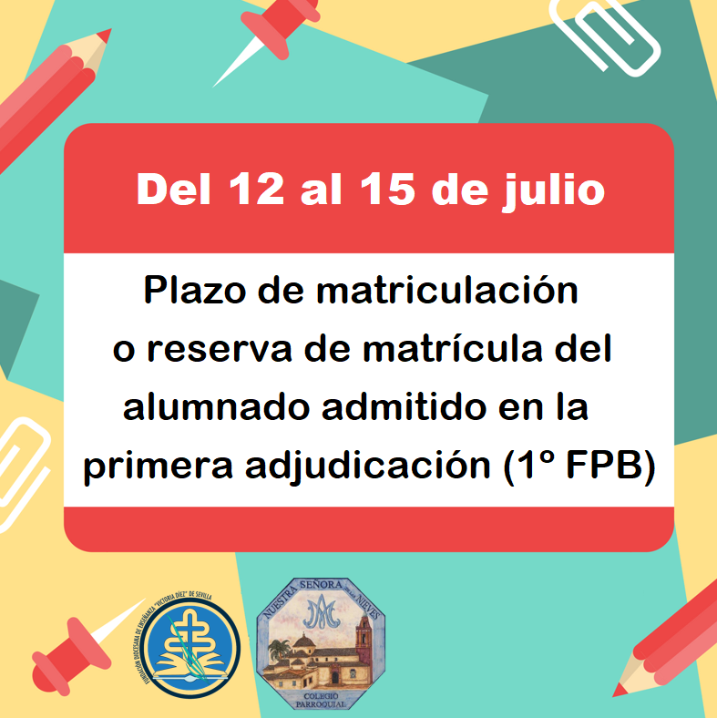 - Del 12 al 15 julio: Los admitidos podrán presentar la matrícula o reserva de matrícula presencial, en horario de 10:00 a 13:00 h., o solicitar el sobre telemático vía correo electrónico.