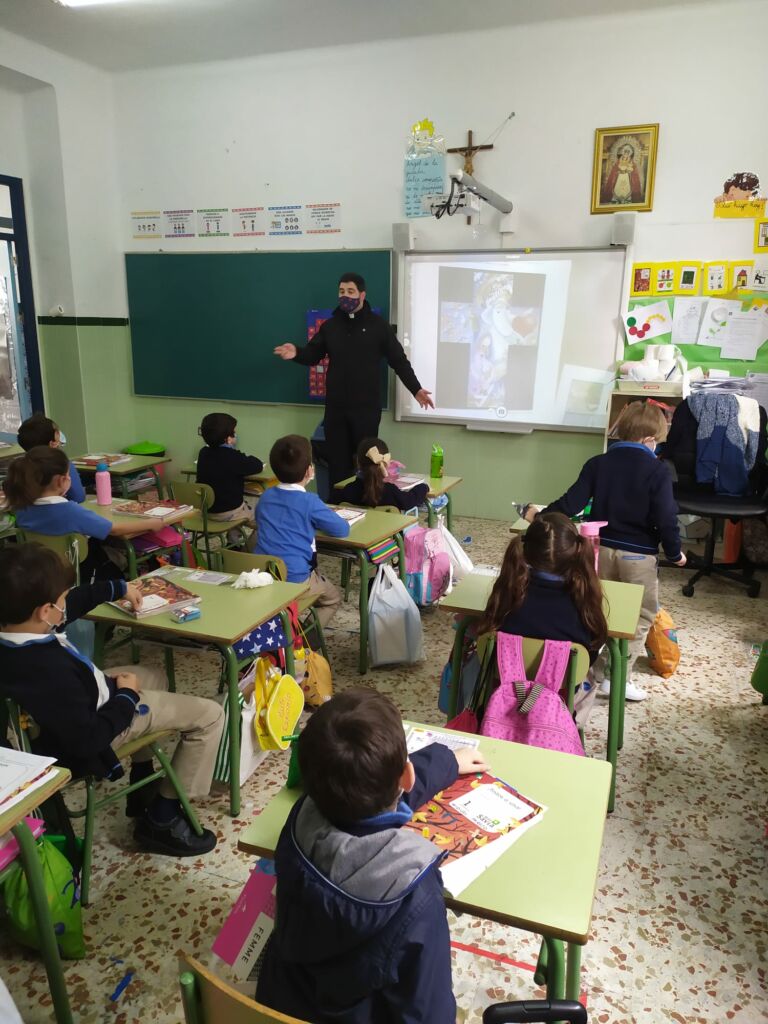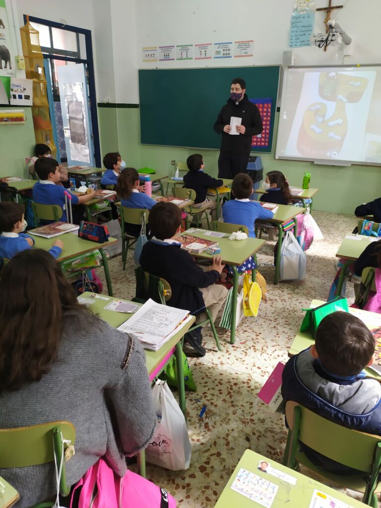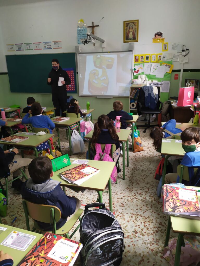 El pasado lunes 8 de marzo, nuestro vicario parroquial D. Pedro Elena García explicó al alumnado de 1º EP el significado de la Cuaresma y la Semana Santa, y la importancia que tiene para los cristianos.