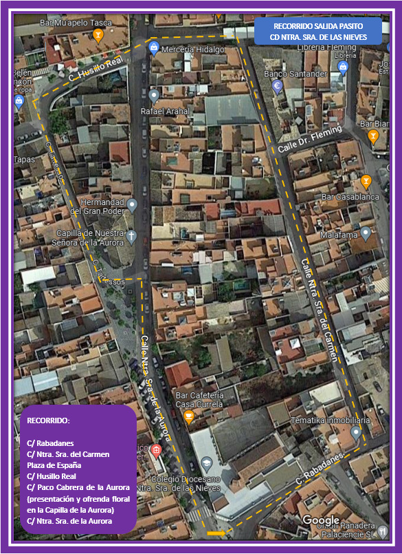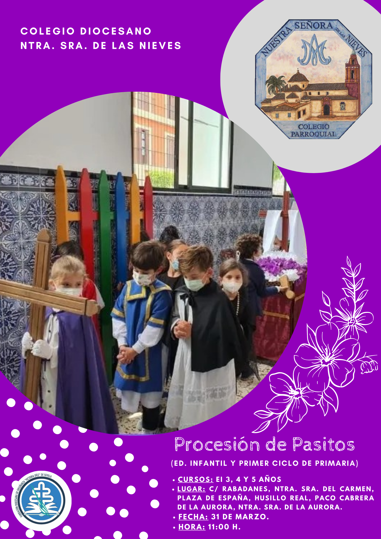 Con motivo de la Semana Santa, el próximo viernes 31 de marzo, tendrá lugar la tradicional Procesión de Pasitos en la que participará el alumnado de Ed. Infantil / 1º y 2º de Ed. Primaria. Dicha procesión se realizará por las calles aledañas al Centro (se adjunta itinerario). Así mismo, se realizará en la Capilla de la Aurora una ofrenda floral a Nuestro Padre Jesús del Gran Poder y a María Santísima de la Soledad.