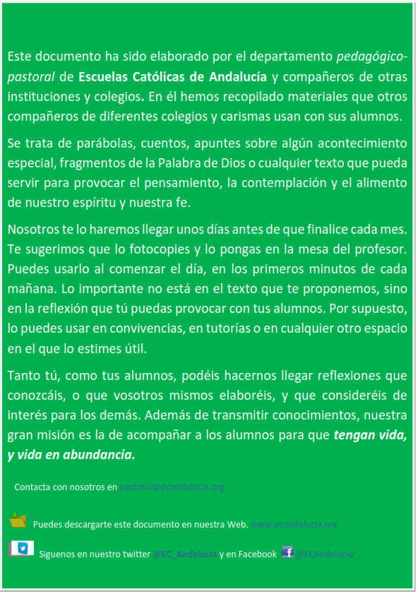 Este documento ha sido elaborado por el departamento pedagógico-pastoral de Escuelas Católicas de Andalucía y compañeros de otras instituciones y colegios.